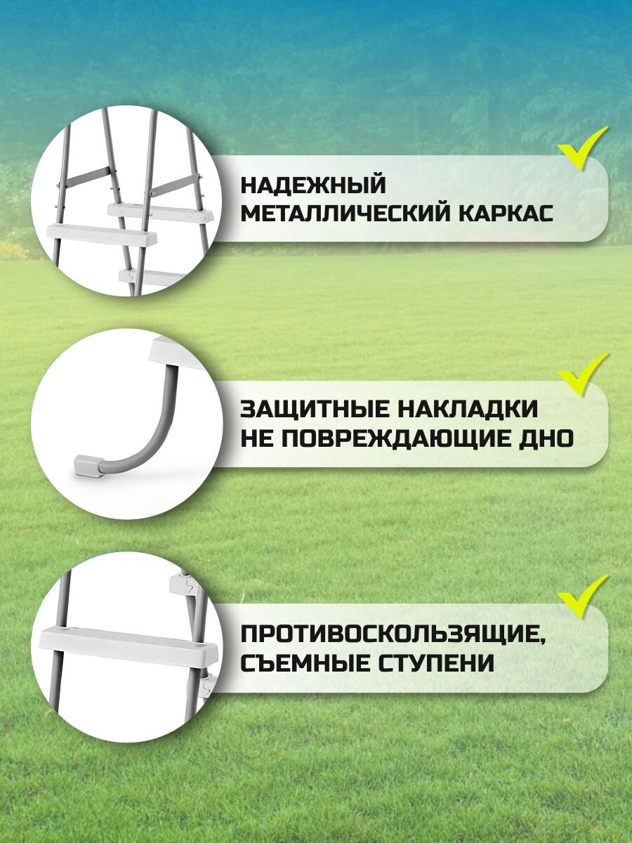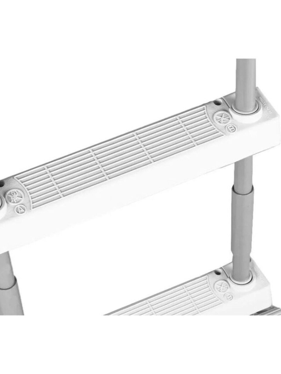 Эта лестница создана для тех, кто ценит качество и долговечность. Благодаря использованию усиленного ABS пластика для ступеней и металлических стоек с влагозащищенным покрытием, она гарантирует устойчивость и надежность в эксплуатации. Высота лестницы полностью соответствует высоте вашего бассейна, что делает ее идеальным выбором для бассейнов высотой 122 см.
