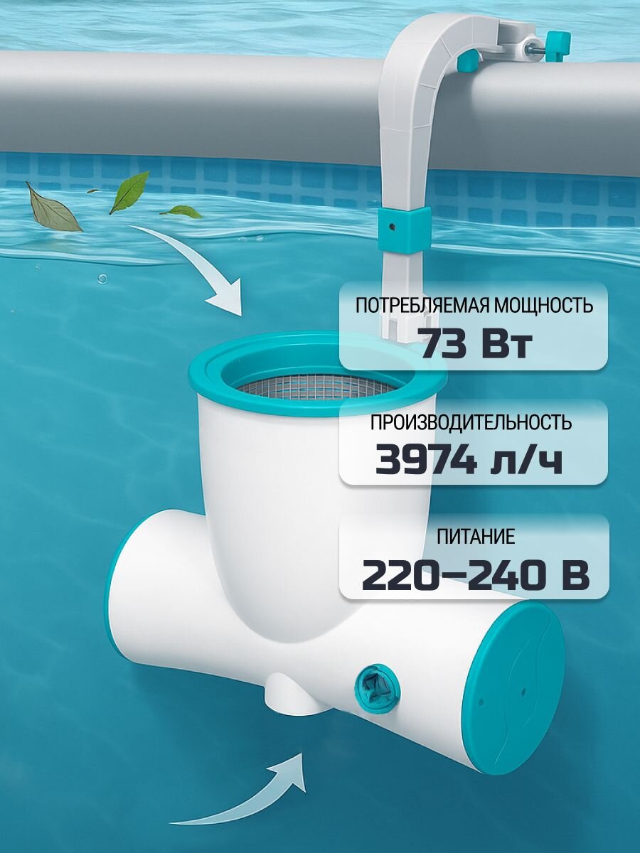 - Эффективная фильтрация: производительность 3974 л/ч обеспечивает быстрое и качественное очищение воды.