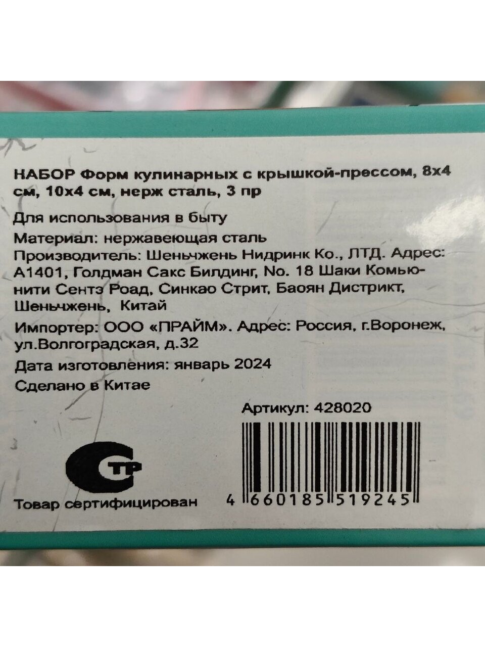 Вы можете приобрести «Форма кулинарная с крышкой-прессом, 8х4 см, 10х4 см, 3 предмета, нержавеющая сталь, Y4-6449» и другие товары в нашем интернет-магазине в Клинцах по низким ценам и с бесплатным самовывозом.