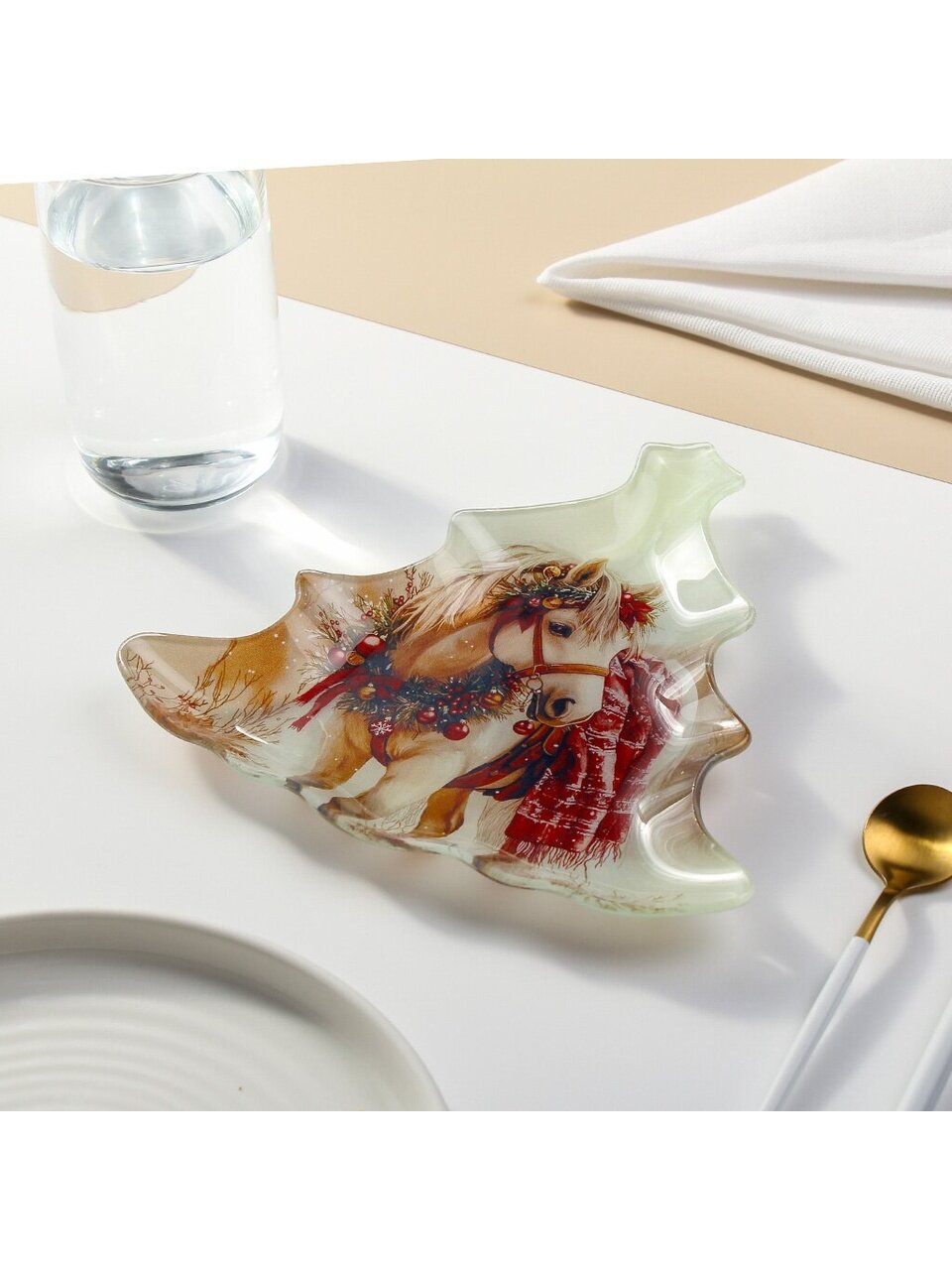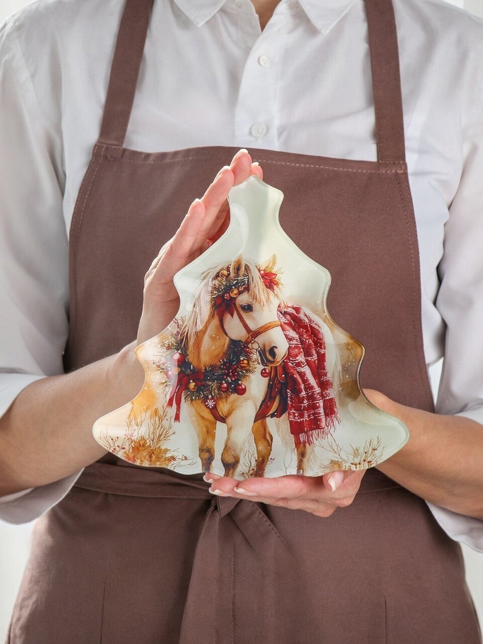 - Эксклюзивный дизайн в форме ёлки и с рисунком Лошади — символа 2026 года, создаёт атмосферу праздника и добавляет уникальности сервировке