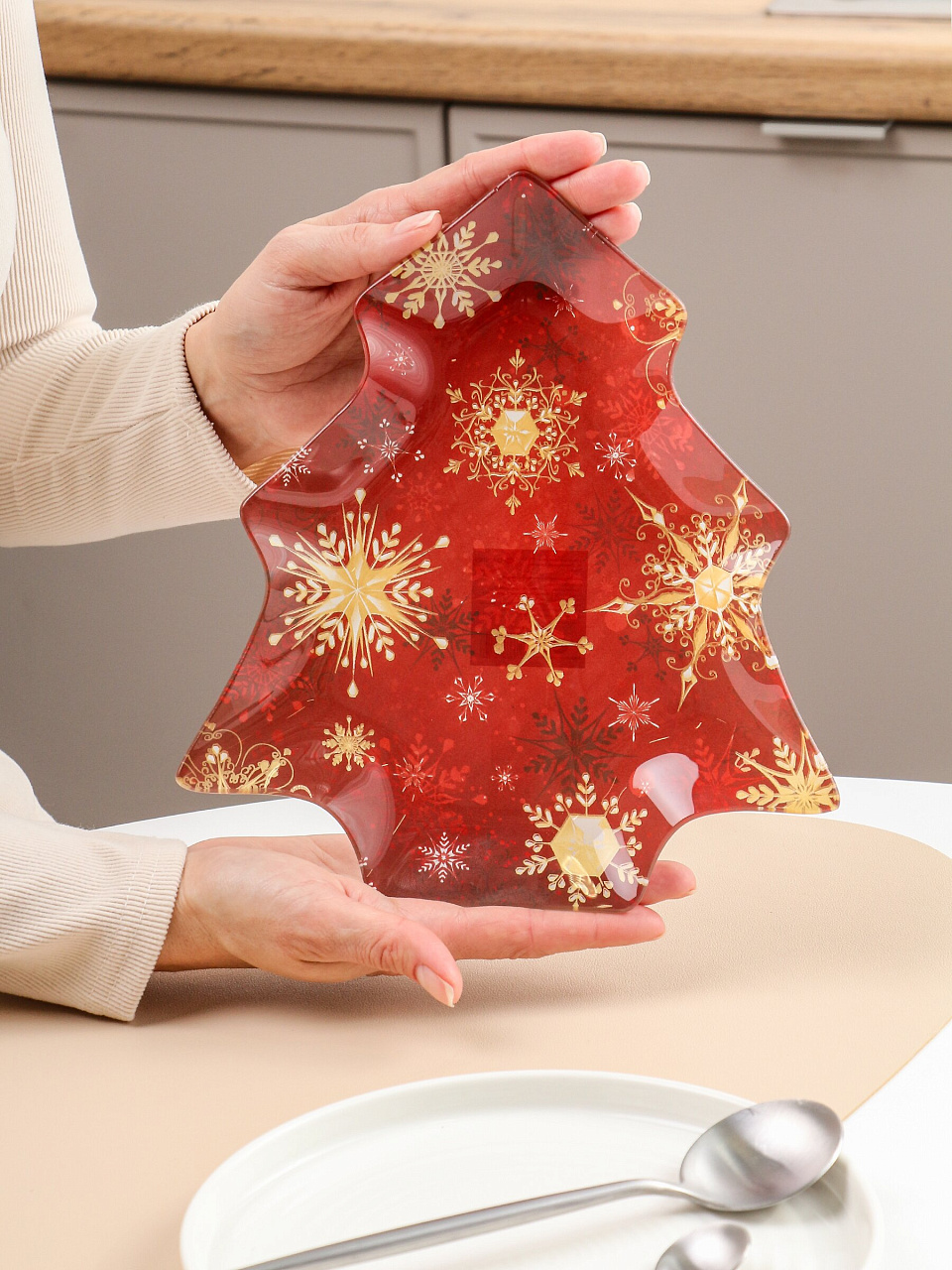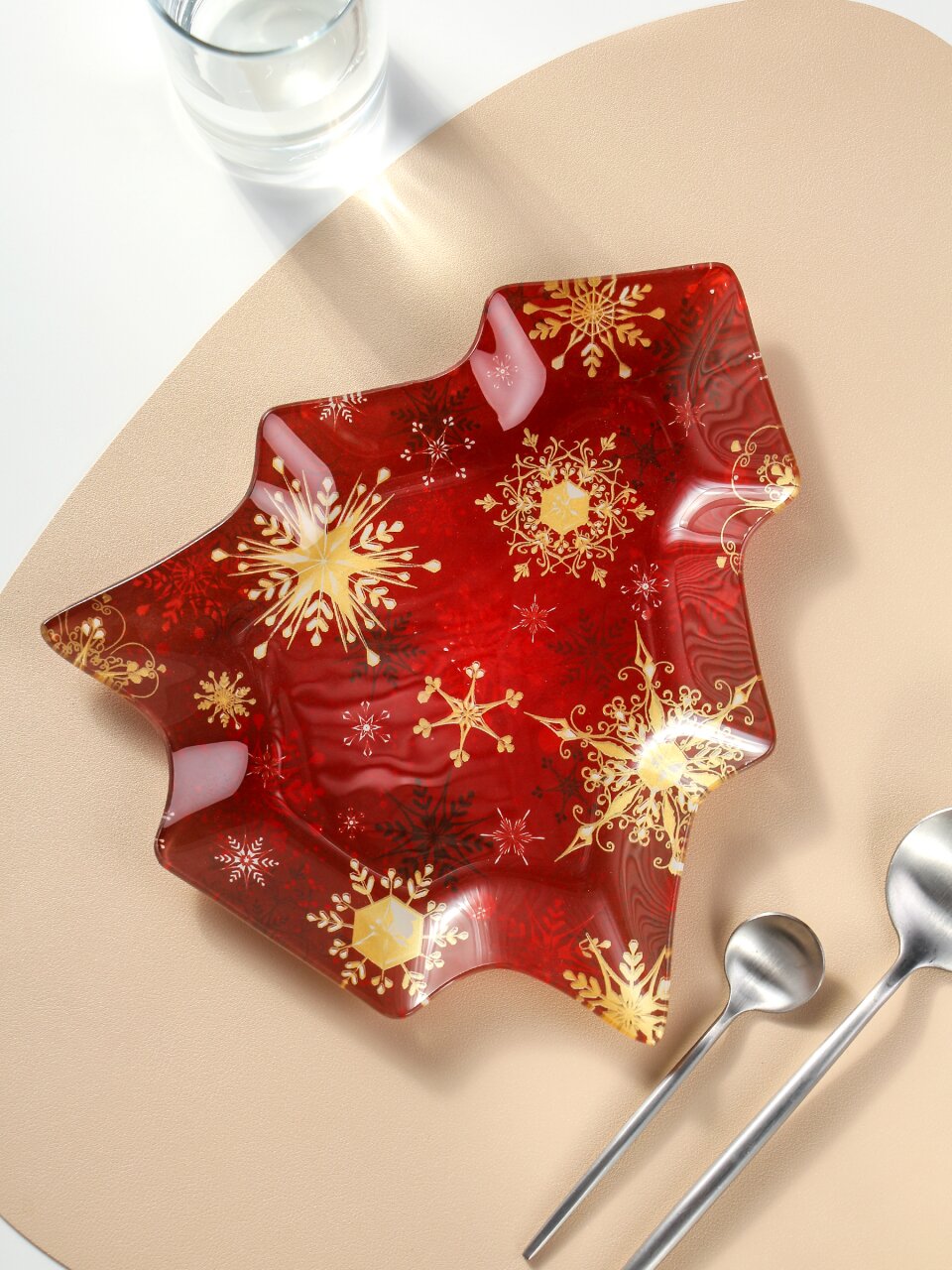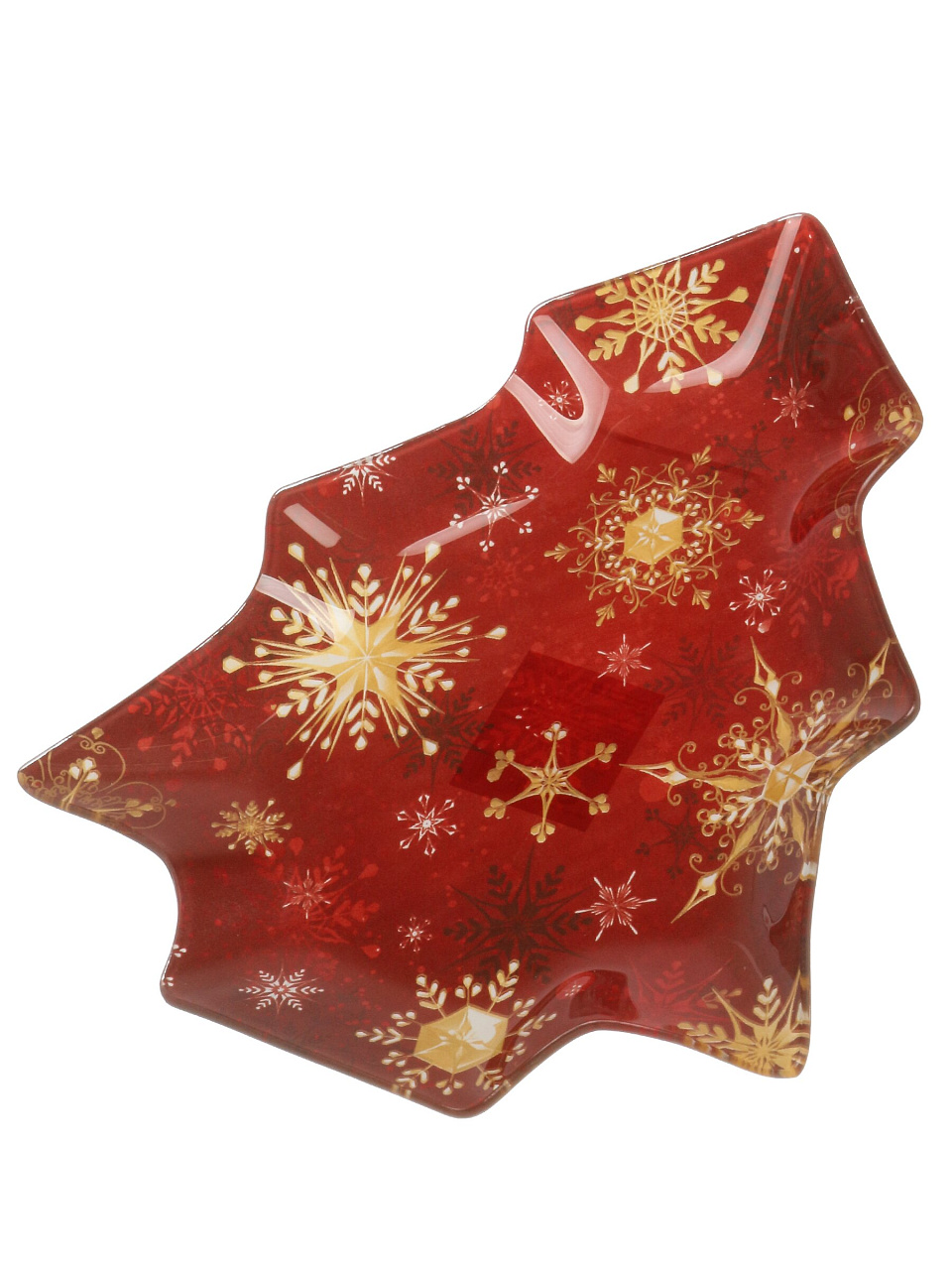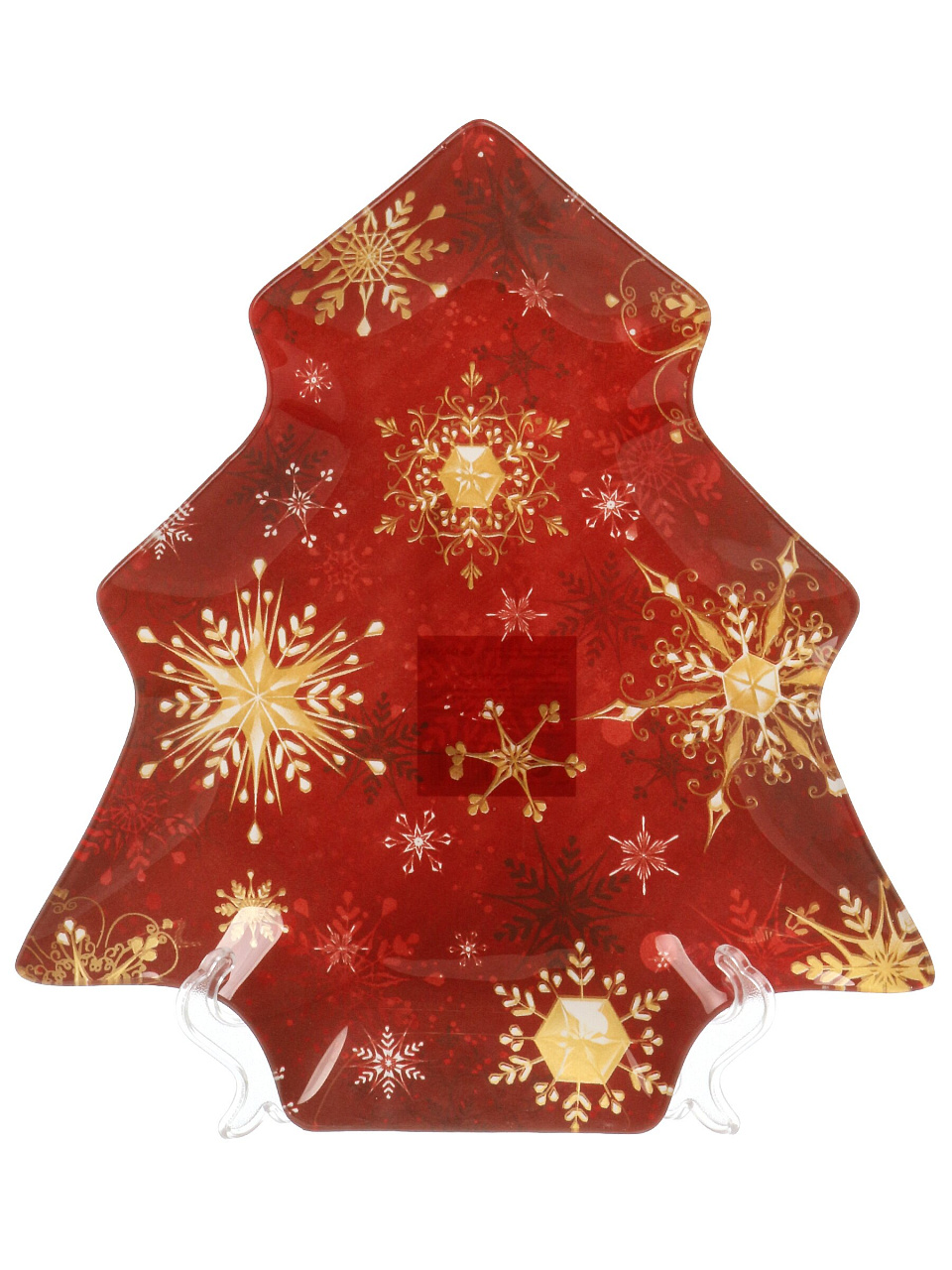 Размер — 25х22.5 см, материал — прочное стекло с бортиками, форма елки, цвет — красный с рисунком «Снежинки».