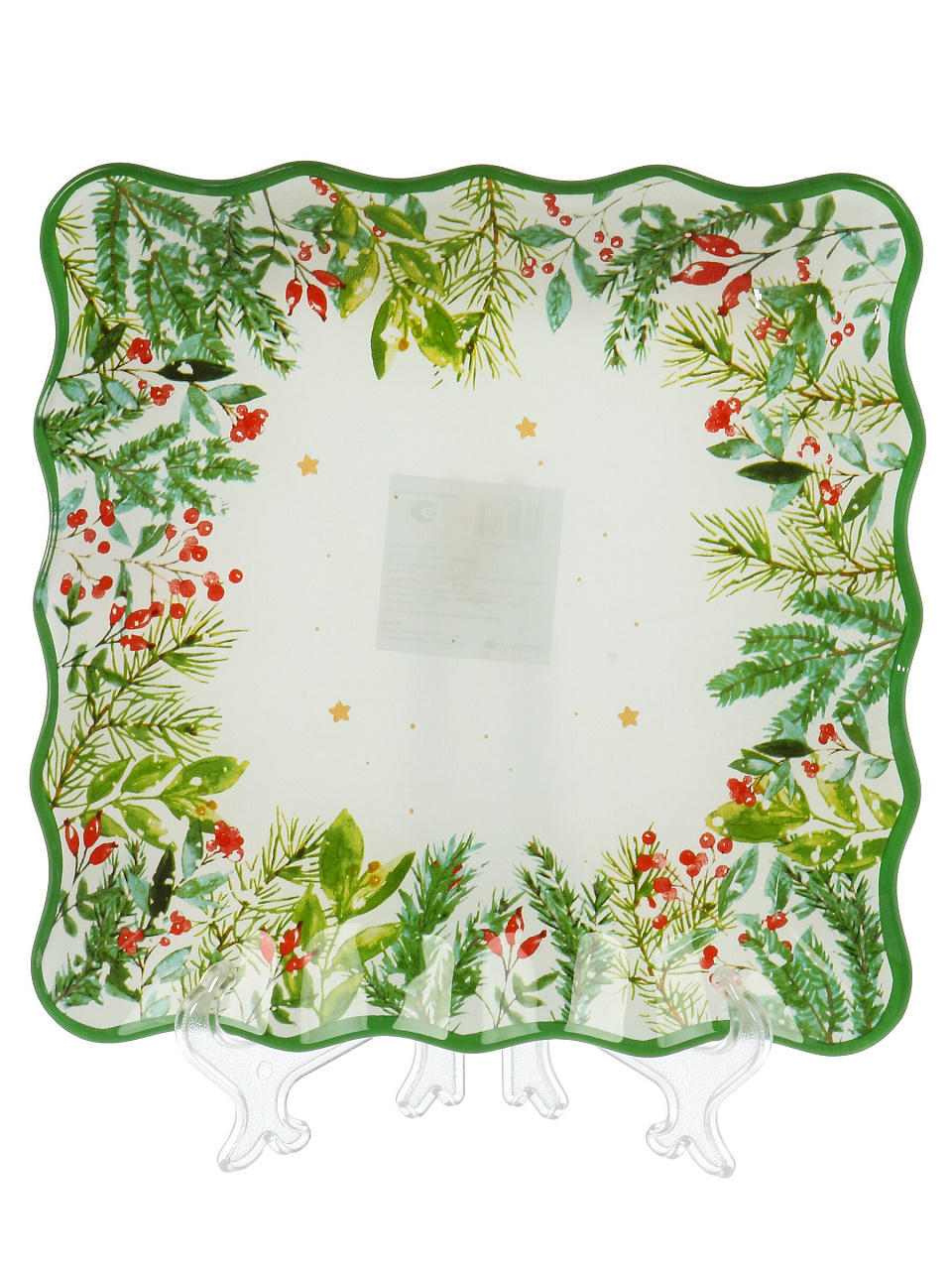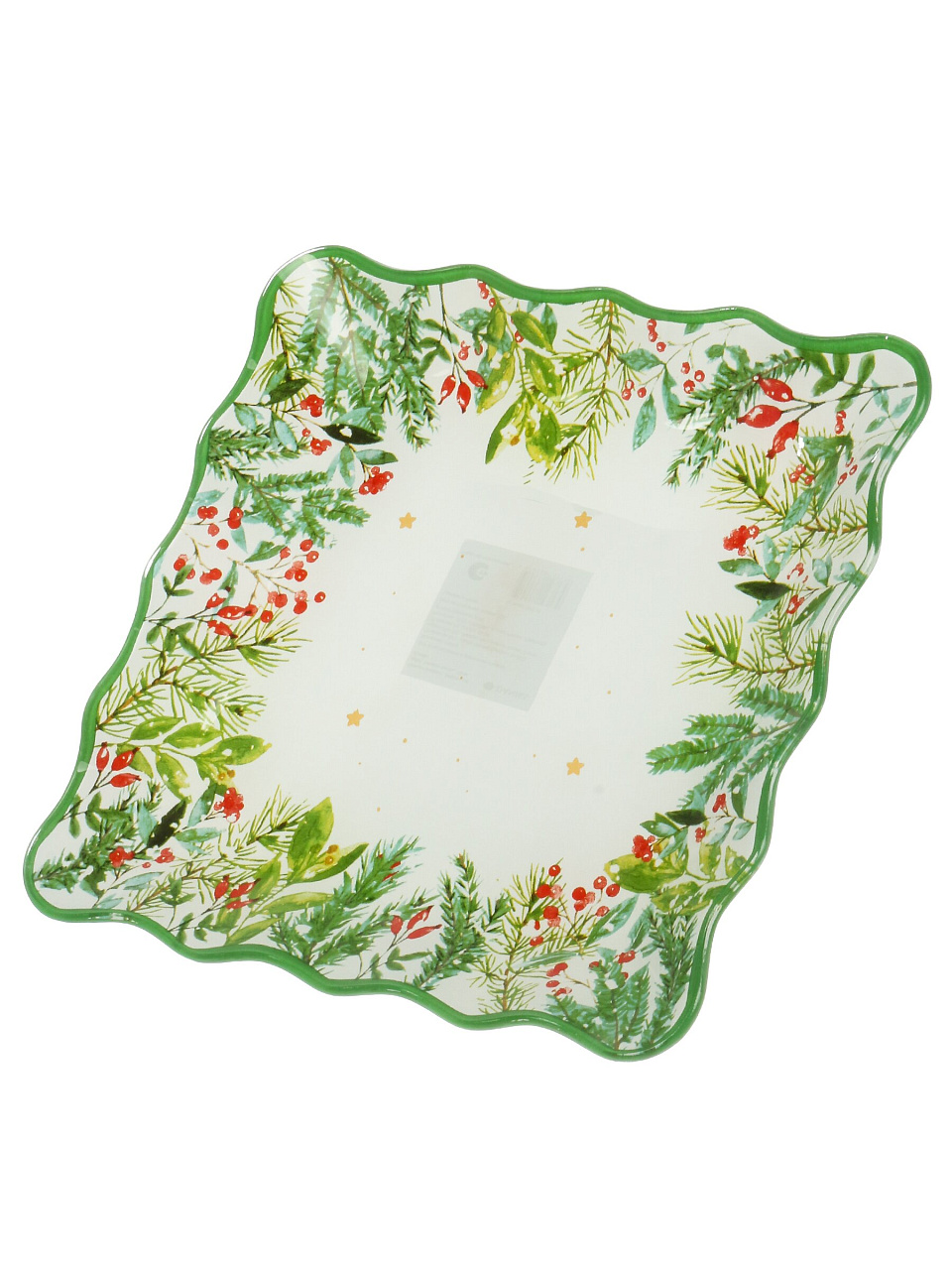Блюдо выполнено в зелёном цвете с рисунком еловой ветки, квадратной формы, с бортиками, коллекция — Daniks «Еловая ветвь».