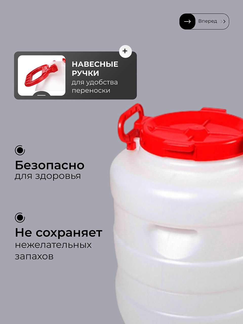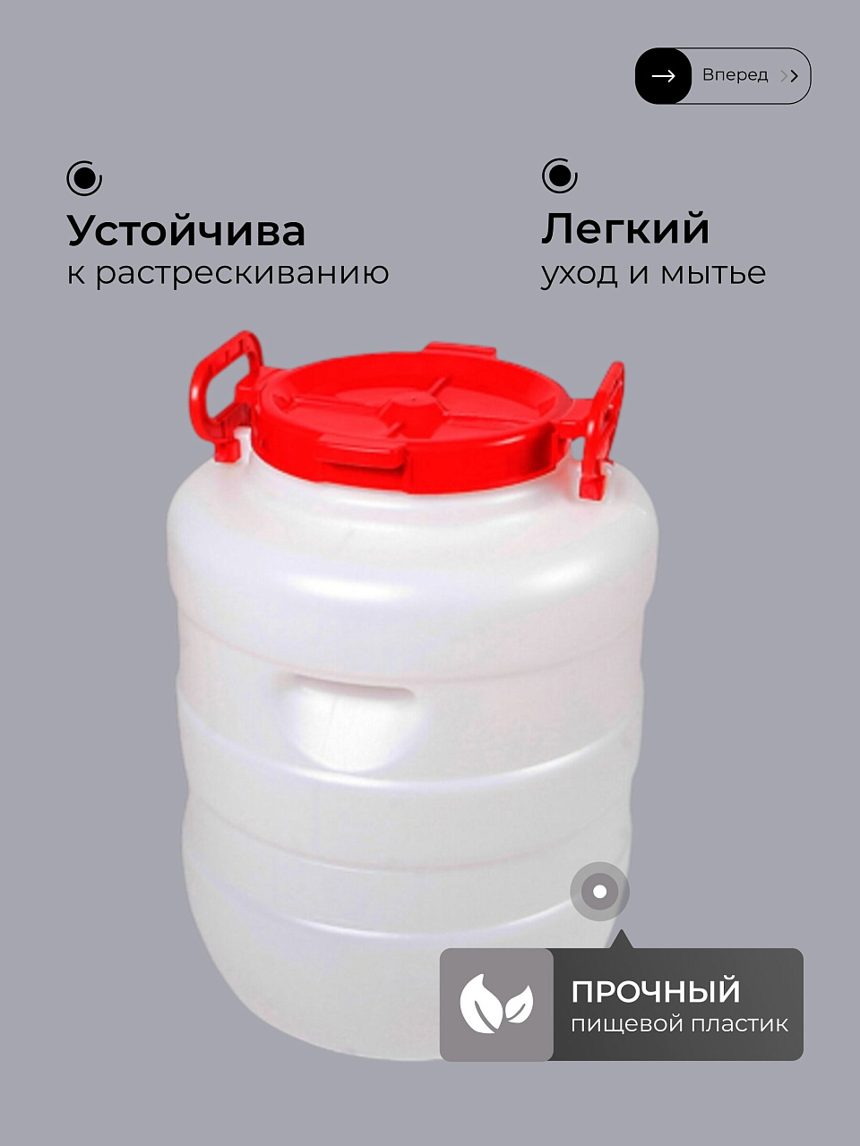 Бочка для воды объемом 40 литров сочетает в себе функциональность и стильный внешний вид. Белый цвет изделия легко впишется в любой интерьер и экстерьер, создавая ощущение чистоты и порядка. Благодаря удобным ручкам, транспортировка и перемещение бочки становится легкой задачей, что особенно важно при использовании на даче или в саду.