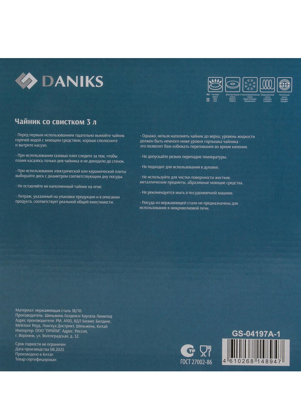 Чайник нерж, 3 л, со свист, нержавеющая сталь, Daniks, GS-04197A-1