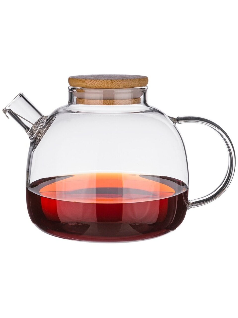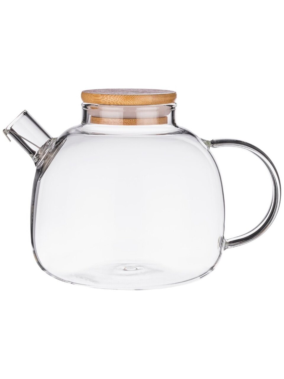 Заварочный стеклянный чайник выполнен в элегантной форме с изысканной ручкой и оснащен стильной бамбуковой крышкой.