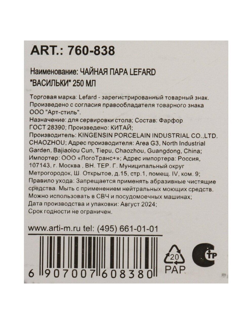Вы можете приобрести «Чайная пара фарфор, 2 предмета, на 1 персону, 250 мл, Lefard, Васильки, 760-838» и другие товары в нашем интернет-магазине в Борисоглебске по низким ценам и с бесплатным самовывозом.