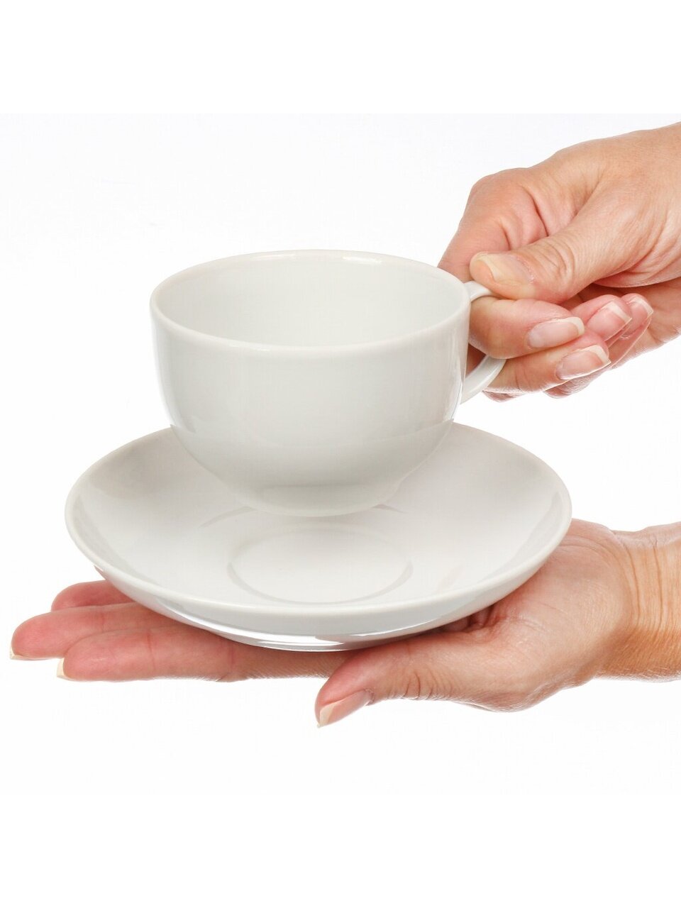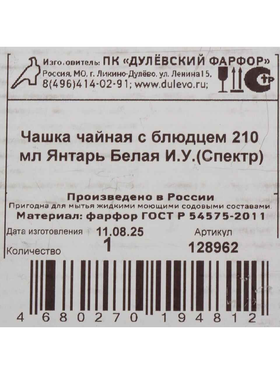 В комплект входит 2 предмета — чашка объёмом 210 мл и блюдце. Набор рассчитан на одного человека.