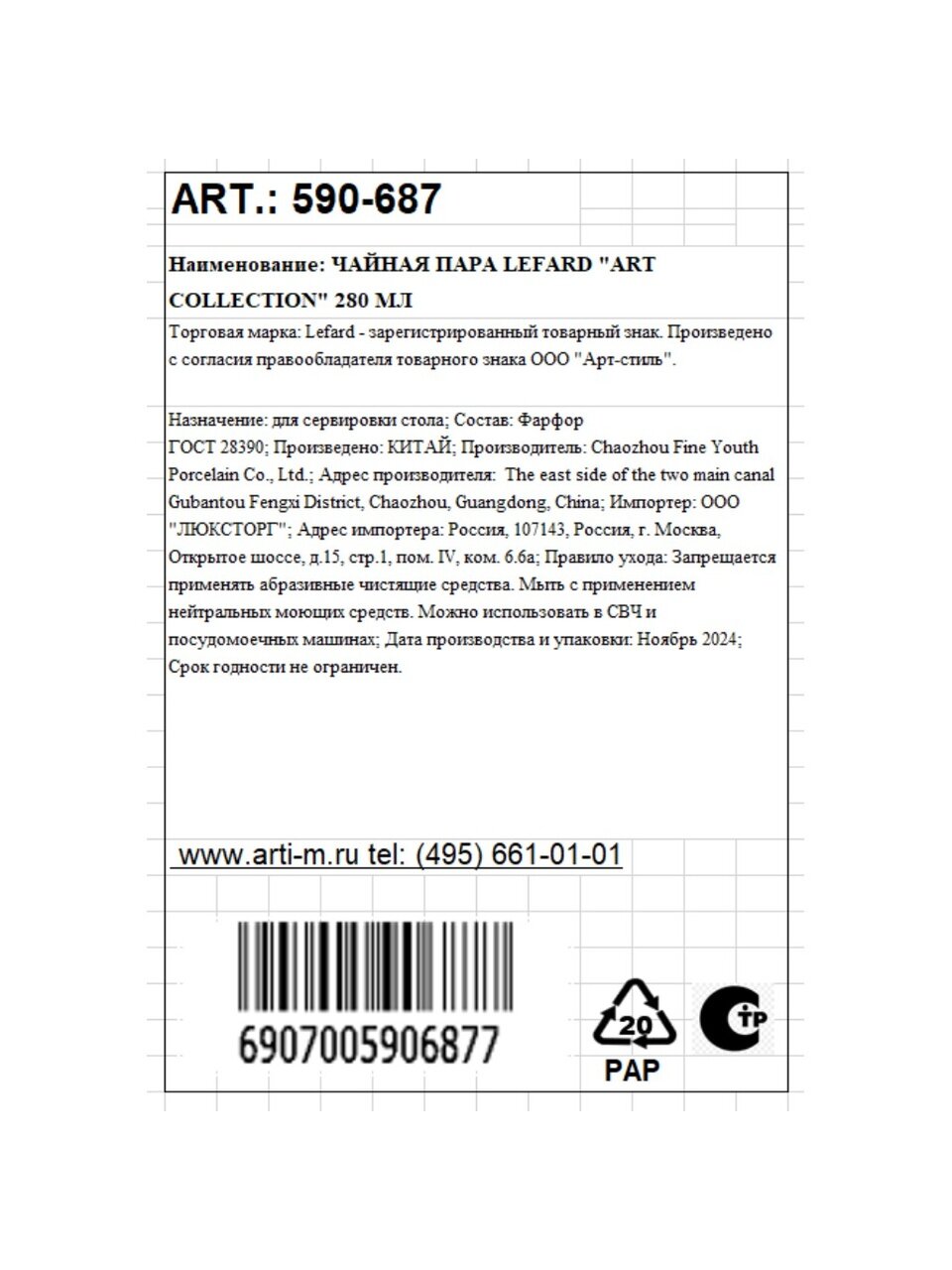 Вы можете приобрести «Чайная пара фарфор, 2 предмета, на 1 персону, 280 мл, Lefard, Art Collection, 590-687» и другие товары в нашем интернет-магазине в Обнинске по низким ценам и с бесплатным самовывозом.