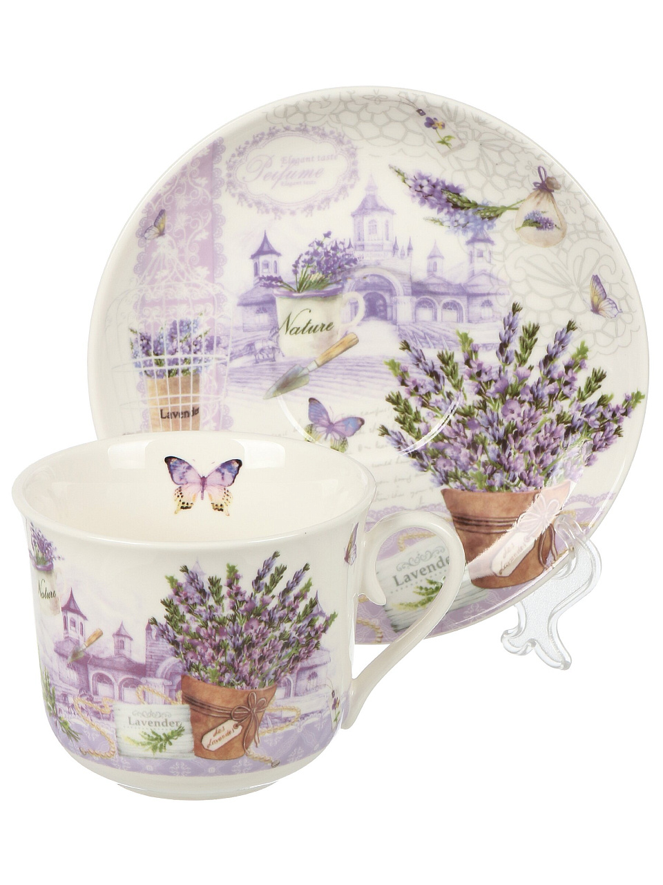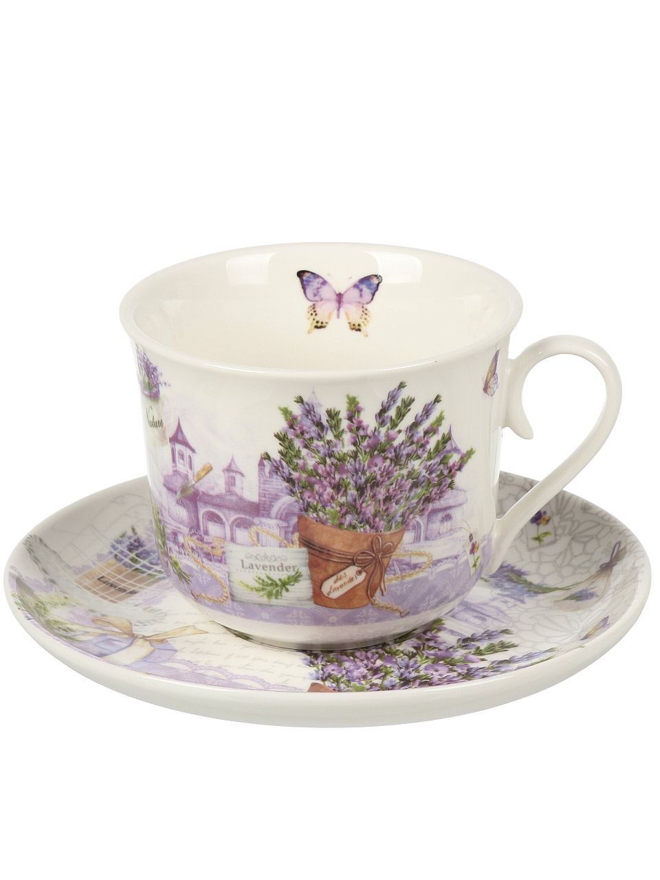 В комплекте 2 предмета: чашка и круглое блюдце, рассчитаны на одного человека. Изготовлено из керамики, цвет — фиолетовый с рисунком, стиль — прованс.