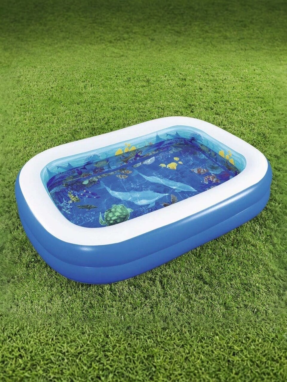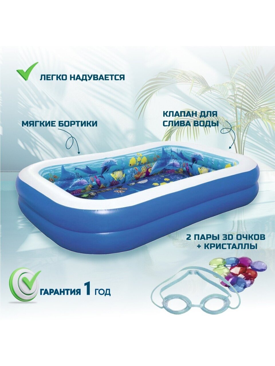 Бассейн изготовлен из прочного ПВХ, что гарантирует долговечность и надежность. Установка занимает всего 10 минут, а благодаря низкому бортику дети смогут легко входить и выходить из воды. В комплекте предусмотрены 2 пары 3D очков и 2 воздушных кольца, добавляющие элемент игры и развлечения.