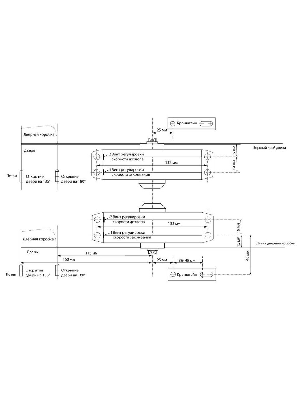 - Модель подходит для дверей весом до 85 кг при угле открывания 135°С и для дверей весом 25-65 кг при угле открывания 180°С.