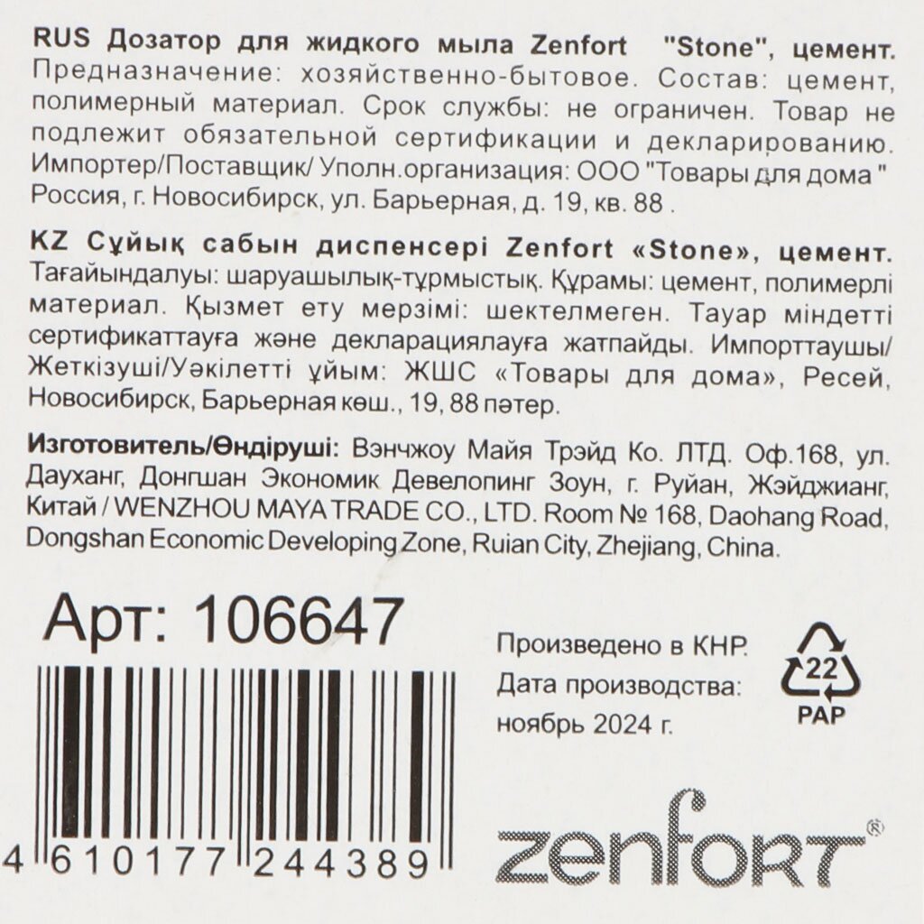 Дозатор Zenfort Stone из керамики и цемента устойчив к перепадам температуры и влаге, не выцветает и не трескается, что делает его отличным выбором для дачи и загородного дома.
