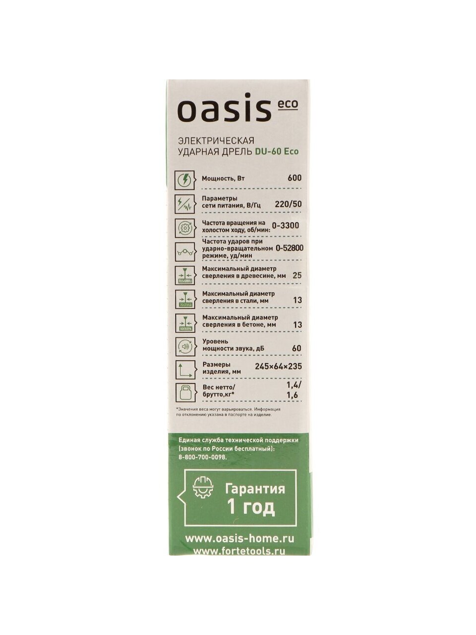 Ударная дрель Oasis DU-60 Eco станет отличным выбором для тех, кто ценит функциональность, долговечность и удобство. Частота ударов до 52800 уд/мин позволяет быстро и качественно выполнять задачи разной сложности. Инструмент легко справляется с металлом (до 13 мм) и деревом (до 25 мм), что делает его универсальным помощником для ремонта, сборки мебели и других домашних работ. Компактная упаковка в коробке облегчает хранение и транспортировку, а гарантия производителя 24 месяца обеспечивает дополнительную уверенность в покупке.