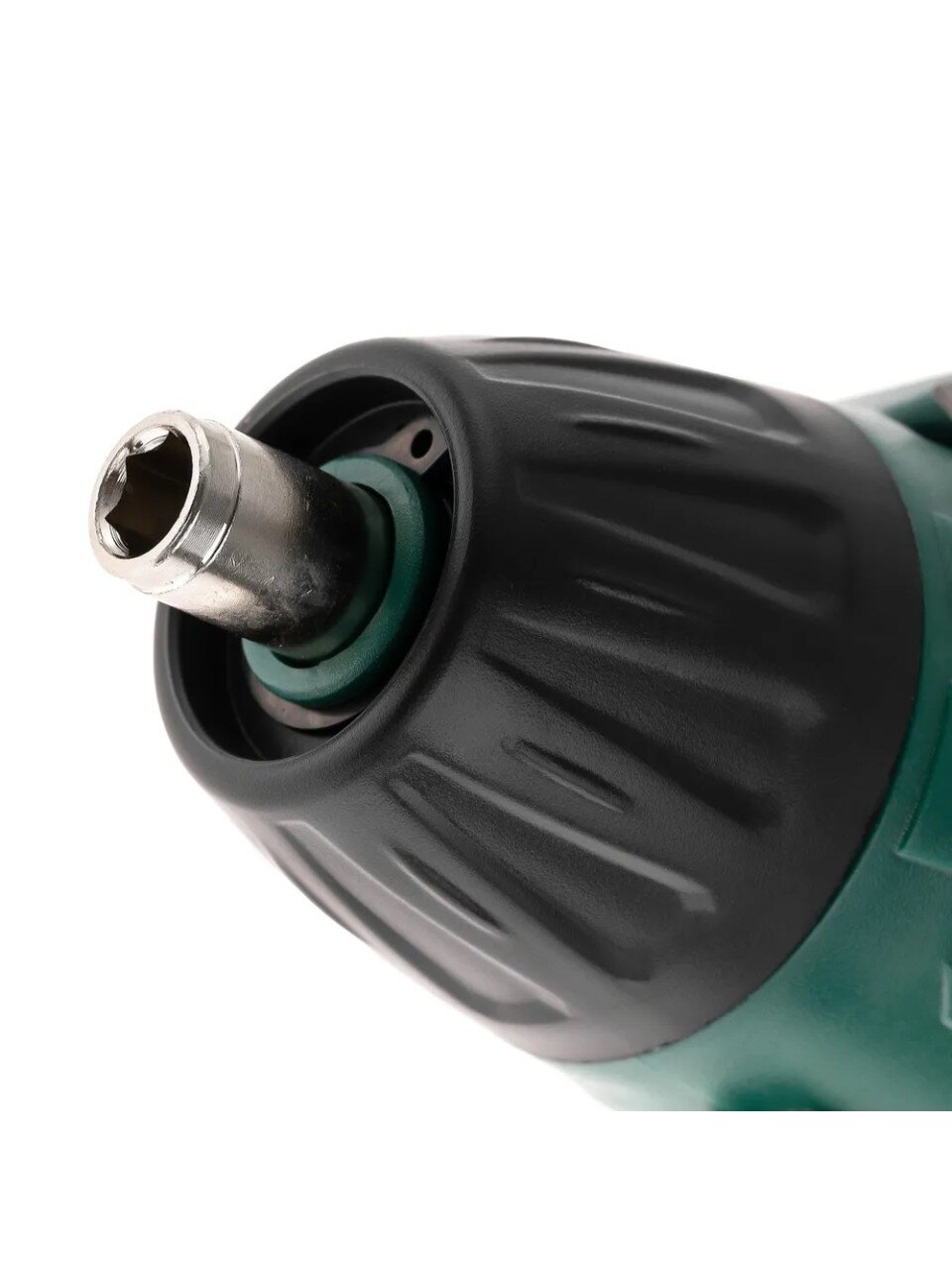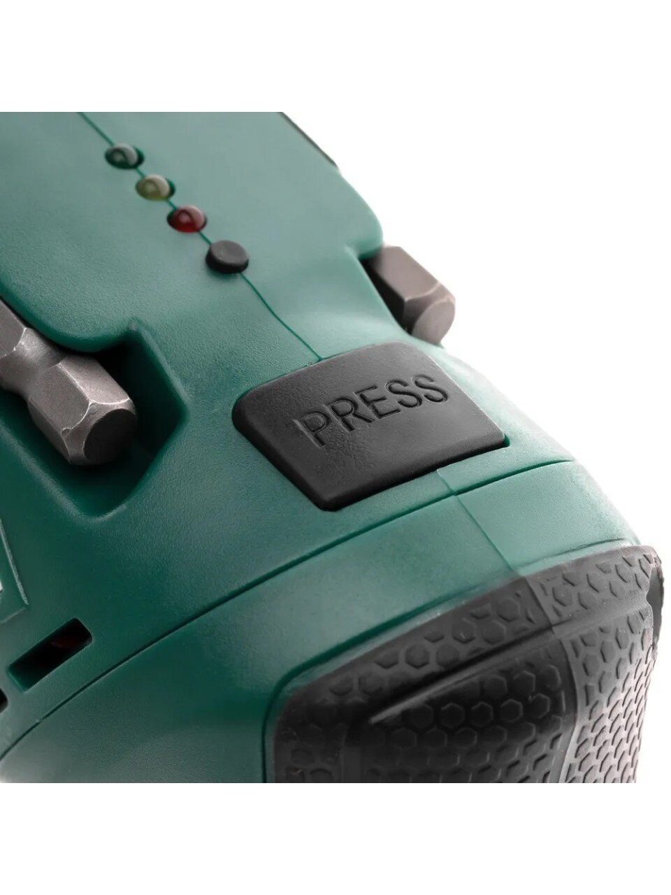 Максимальная скорость — 230 об/мин. В комплекте: аккумуляторная отвертка и набор бит для разных типов крепежа.