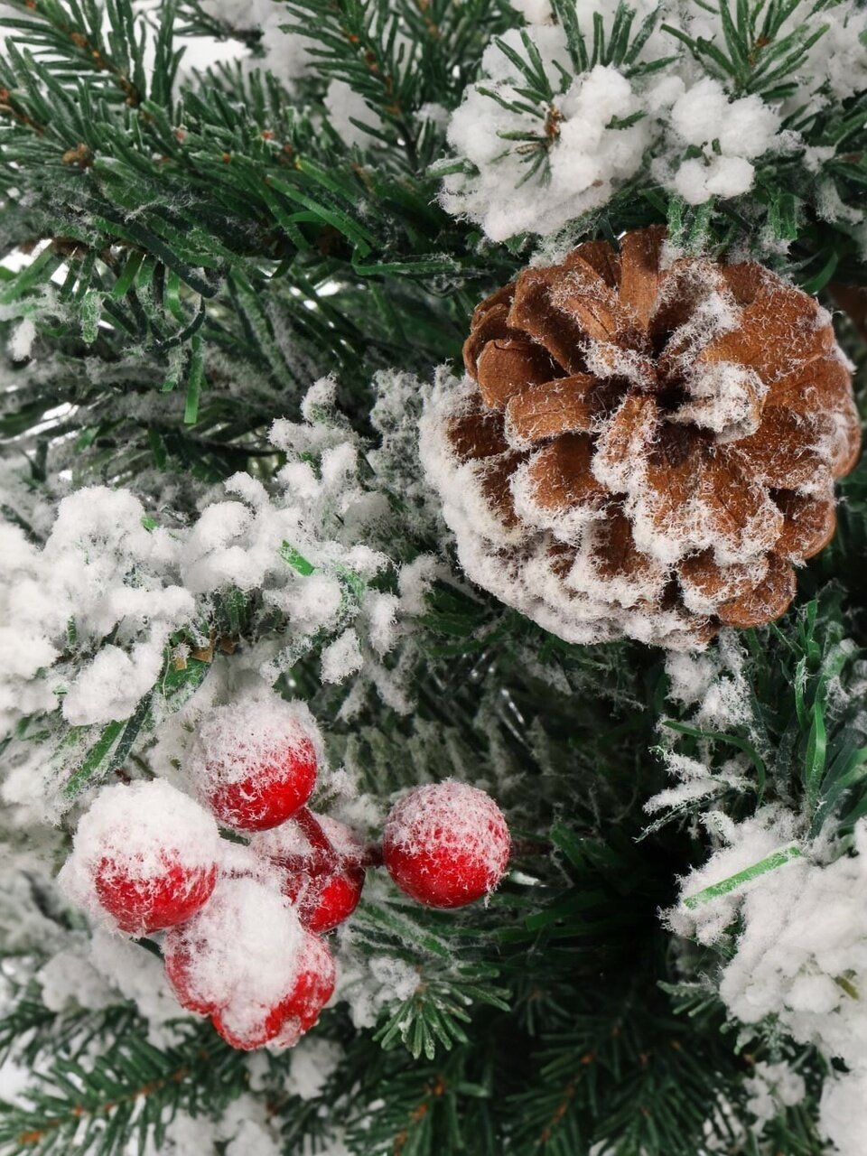 - Декор премиум-класса: заснеженные ветки, шишки и красные ягоды создают эффект настоящей ели