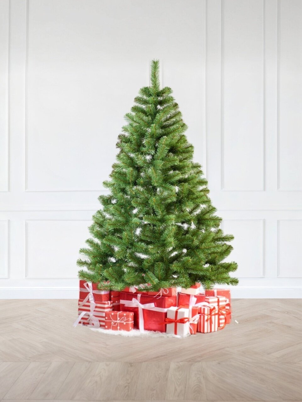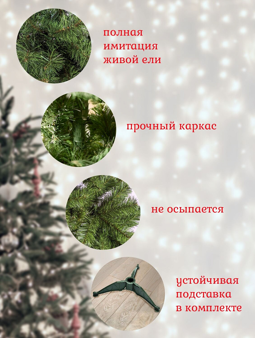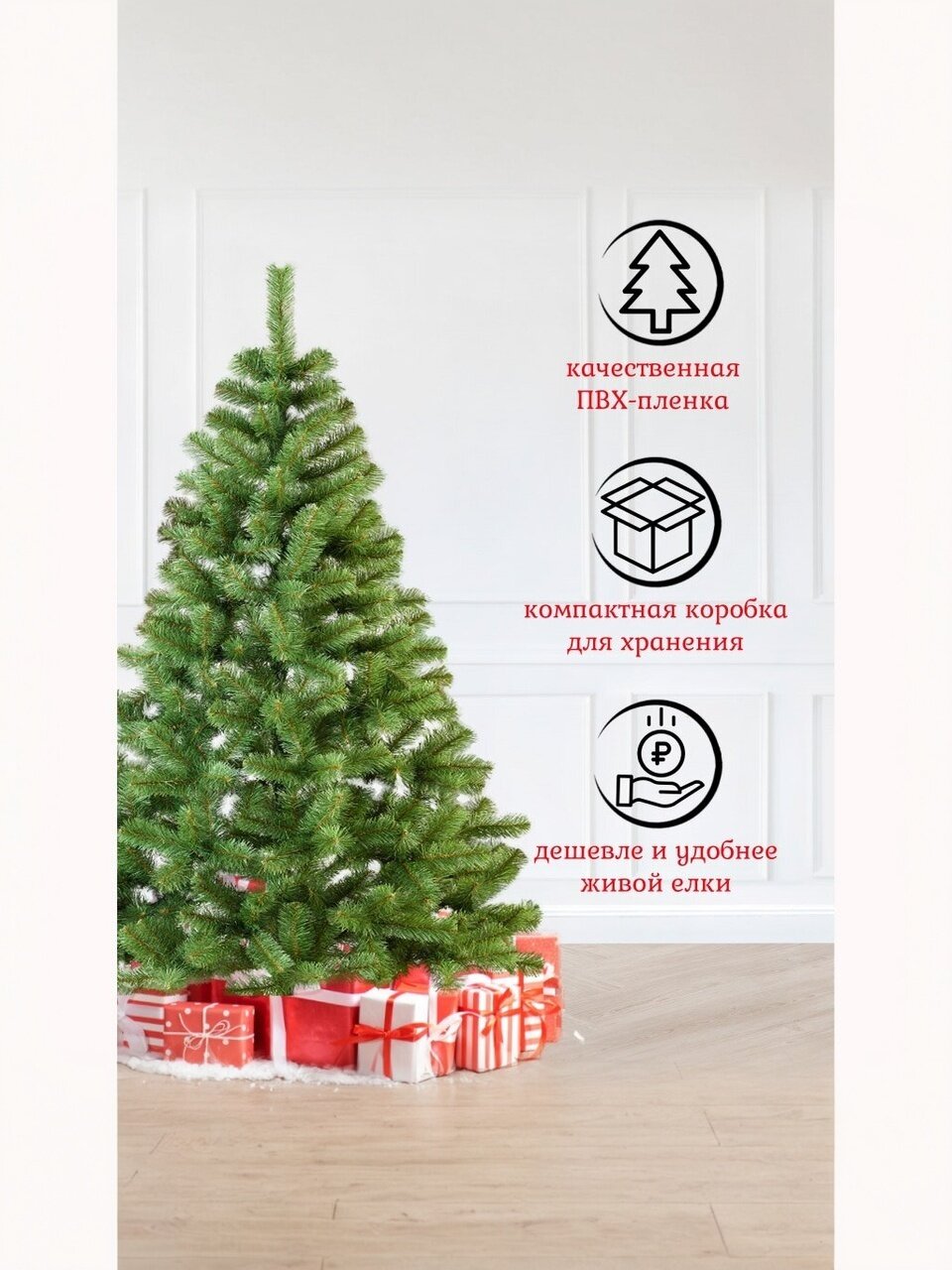 - Пышная и натуральная хвоя из ПВХ-пленки — безопасна для детей и домашних животных, не осыпается, легко собирается.