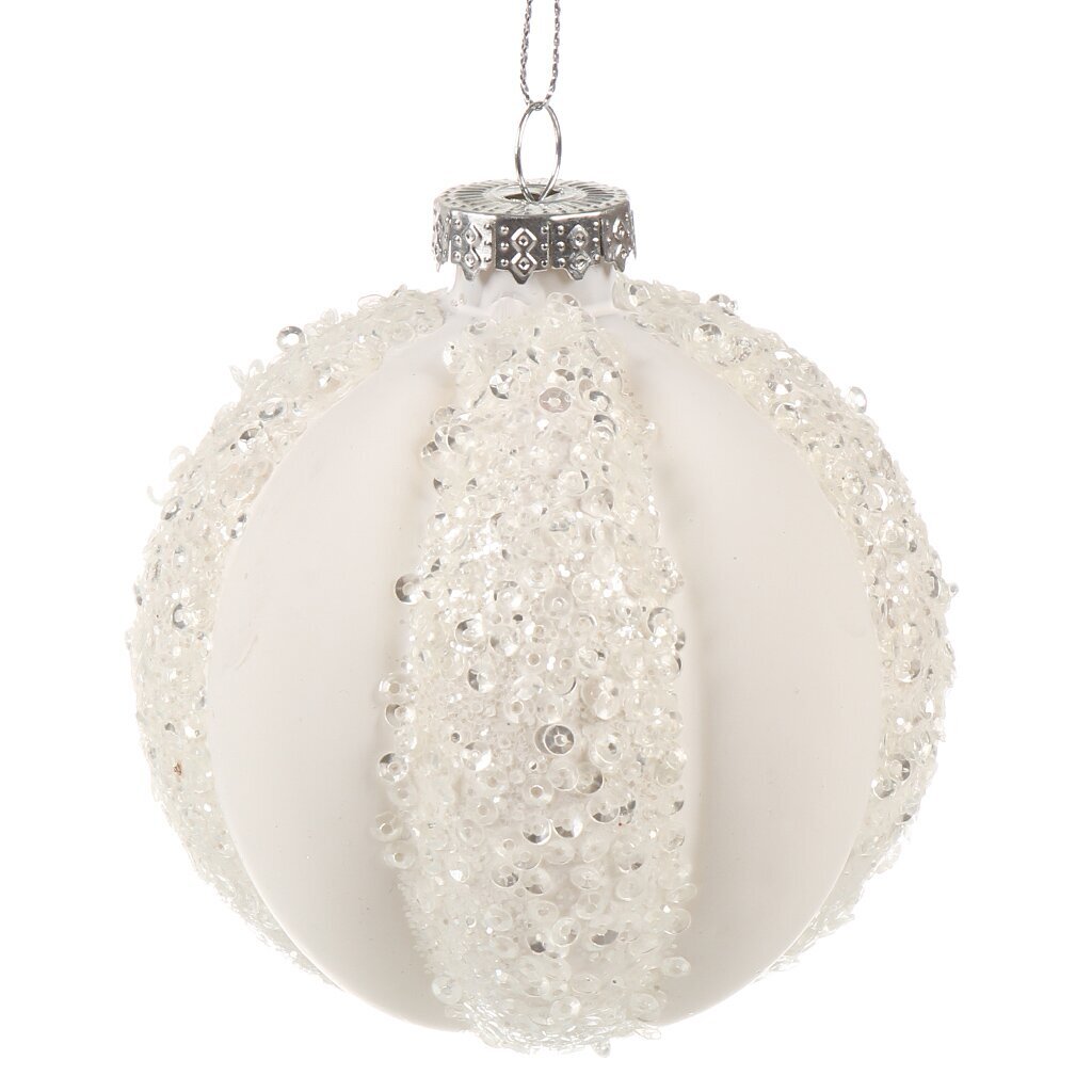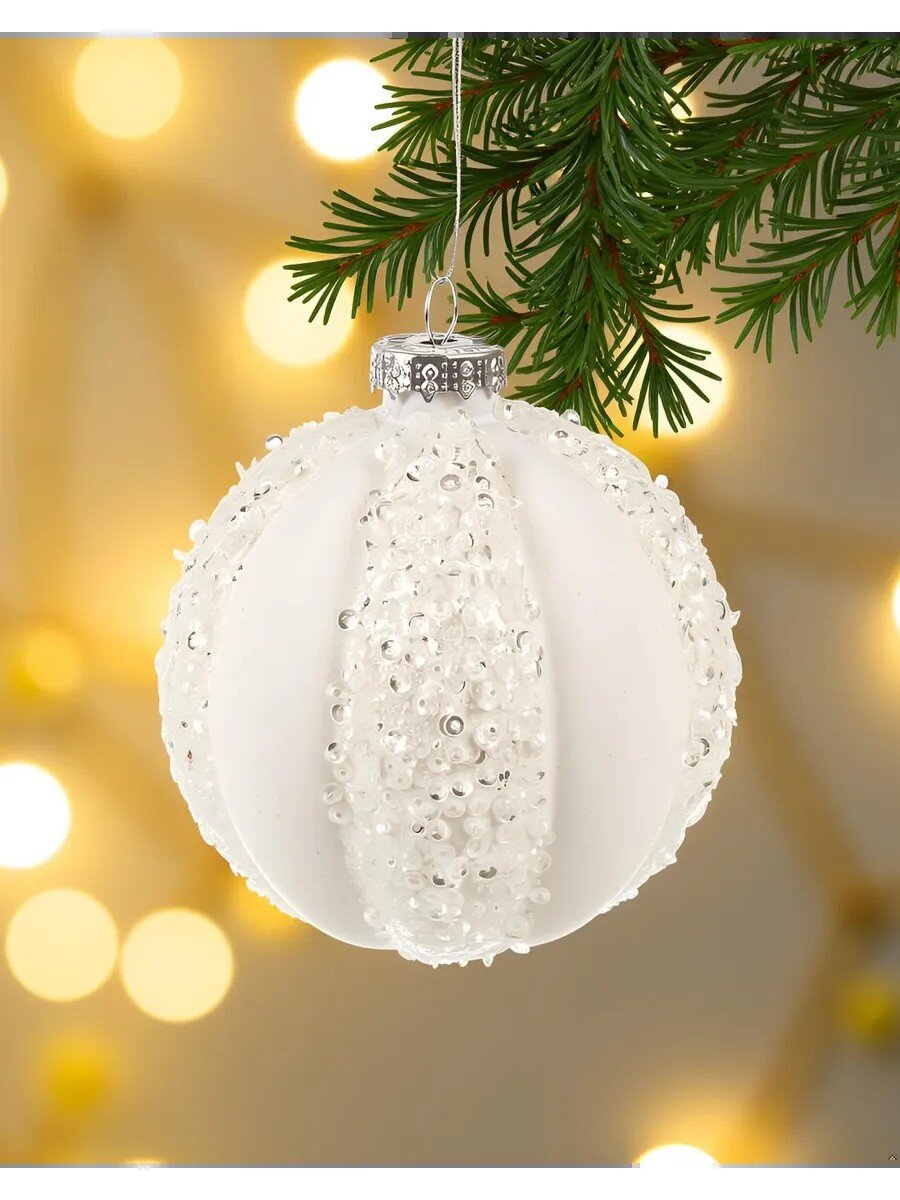 Елочный шар «Снежок» 8 см из стекла — эффектный белый декор с блестками для стильной елки. Идея подарка и уют в доме без переплат.