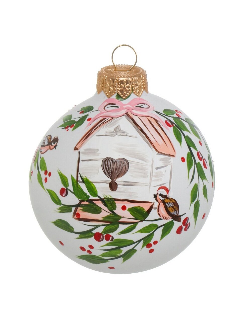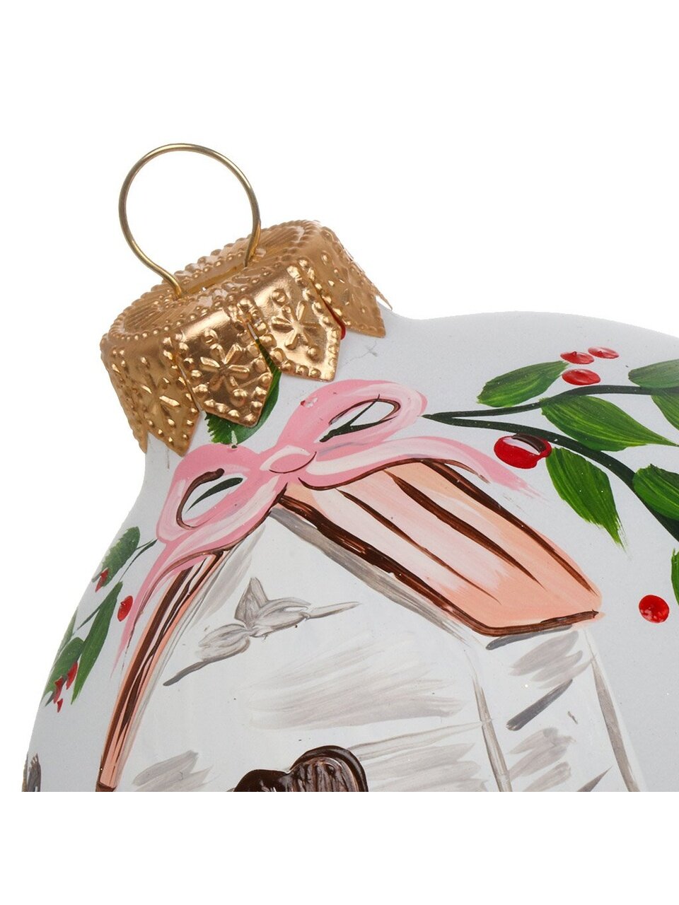 Шар изготовлен из натурального стекла, расписан вручную, диаметр — 8 см, крепится на подвеске. Поставляется в коробке для безопасного хранения.