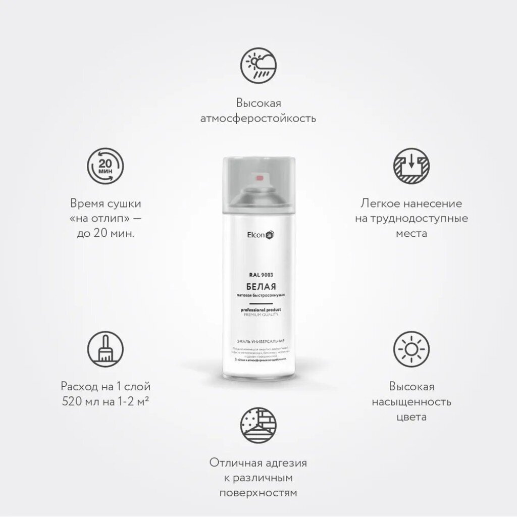Вы можете приобрести «Эмаль аэрозольная, Elcon, универсальная, быстросохнущая, акриловая, матовая, белая, RAL 9003, 520 мл» и другие товары в нашем интернет-магазине в Клинцах по низким ценам и с бесплатным самовывозом.