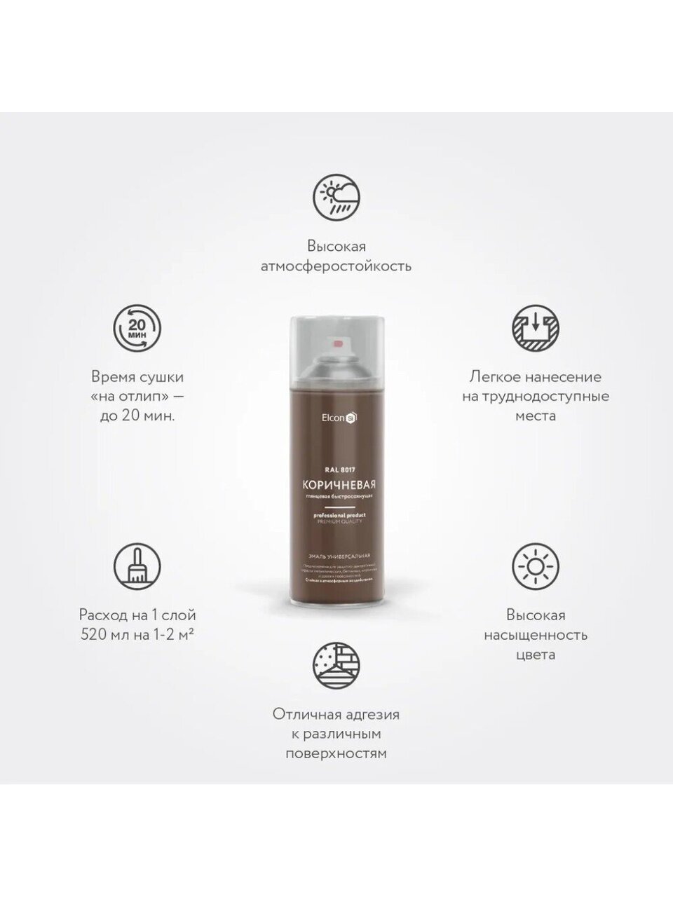 Вы можете приобрести «Эмаль аэрозольная, Elcon, универсальная, быстросохнущая, акриловая, глянцевая, коричневая, RAL 8017, 520 мл» и другие товары в нашем интернет-магазине в Борисоглебске по низким ценам и с бесплатным самовывозом.
