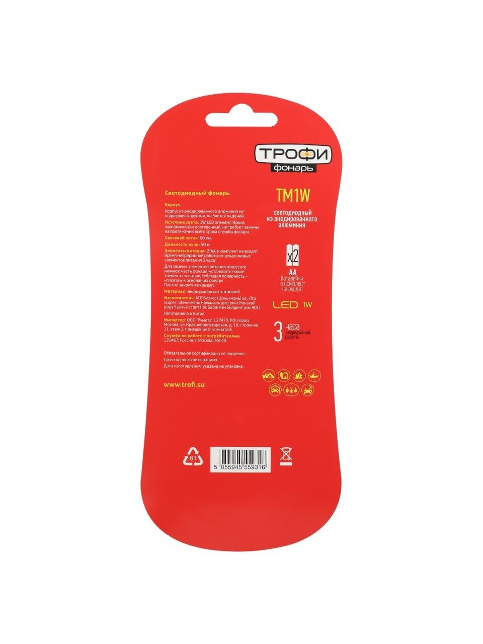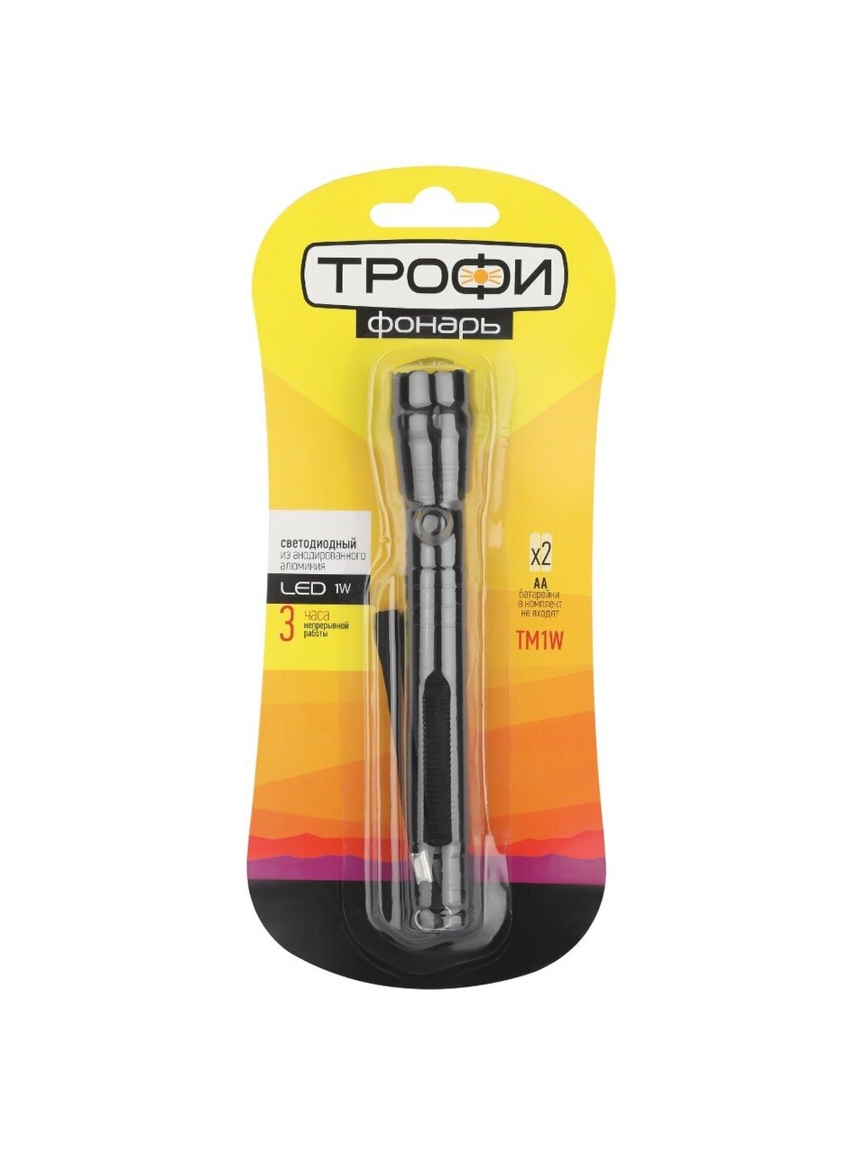 Трофи ТМ1W - компактный светодиодный фонарь с удобной удлинённой ручкой. Корпус изготовлен из прочного анодированного алюминия. Универсальный лаконичный дизайн, базовый чёрный цвет. Хорошая дальность светового луча.