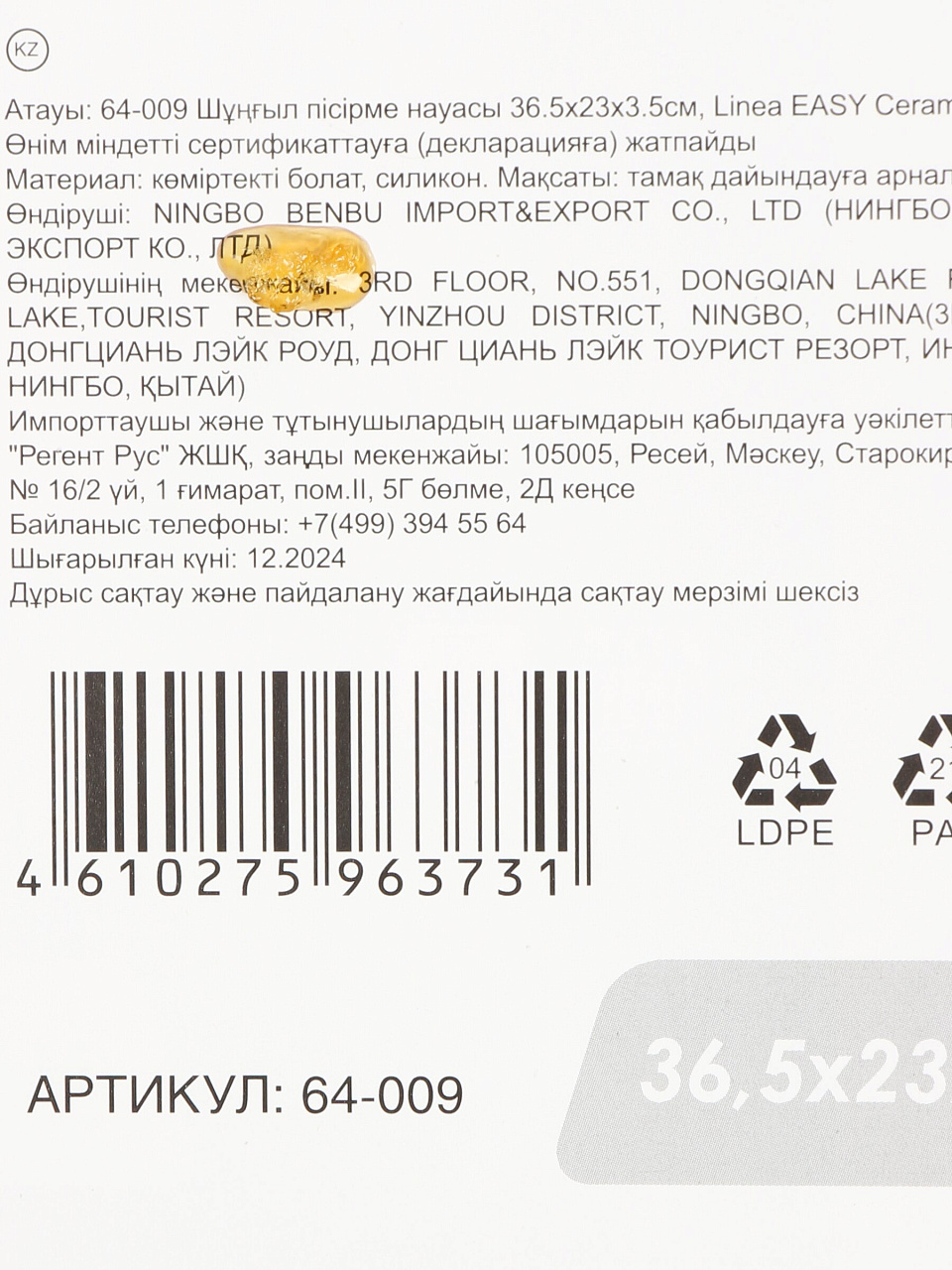 Ширина — 23 см, длина — 36,5 см, высота — 3,5 см; подходит для запекания больших порций и блюд для всей семьи.