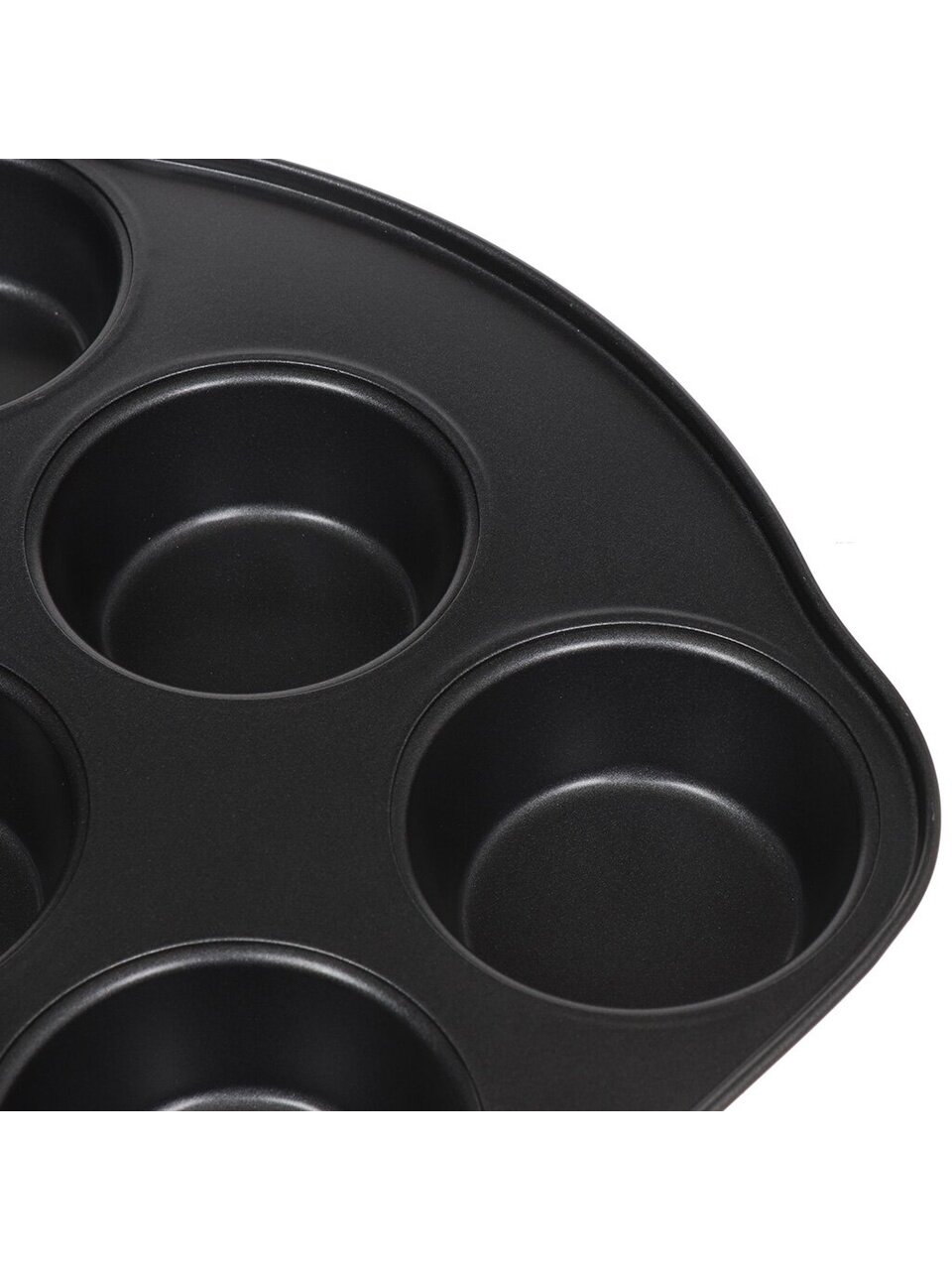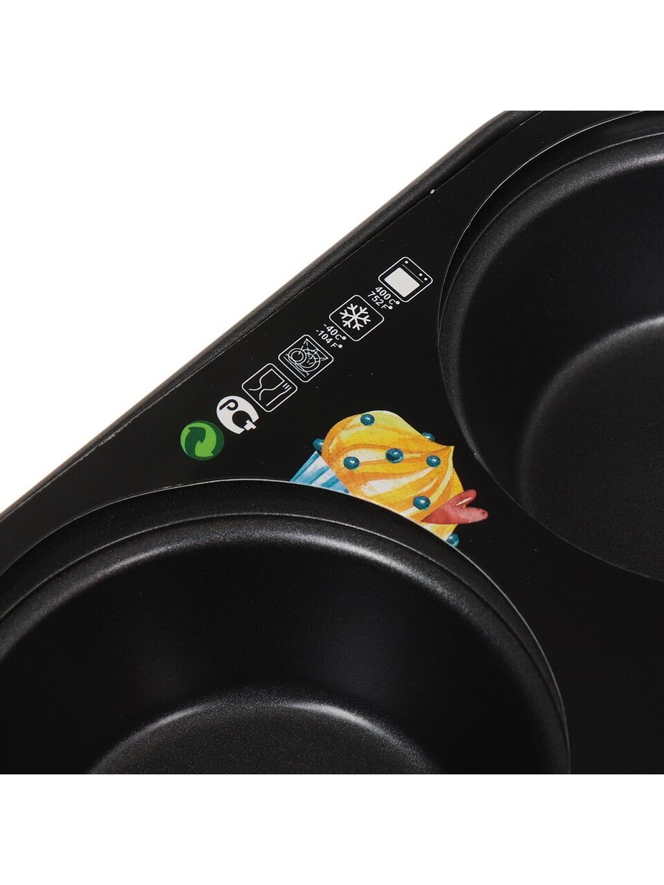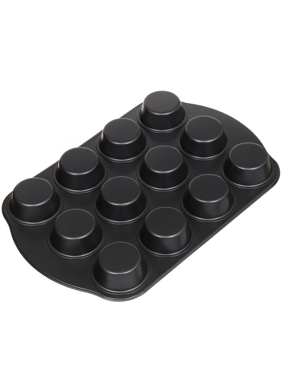 Размер формы — 26,5×41×3,3 см, количество ячеек — 12, каждая рассчитана на стандартный маффин. Материал — сталь с антипригарным покрытием, цвет — черный.