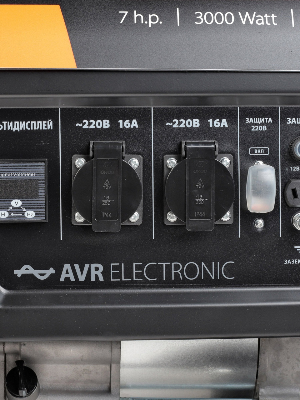 Максимальная мощность — 3 кВт, активная — 2,8 кВт, напряжение 230 В и 12 В, сила тока розетки — 12,2 А, одна фаза, ручной стартер.