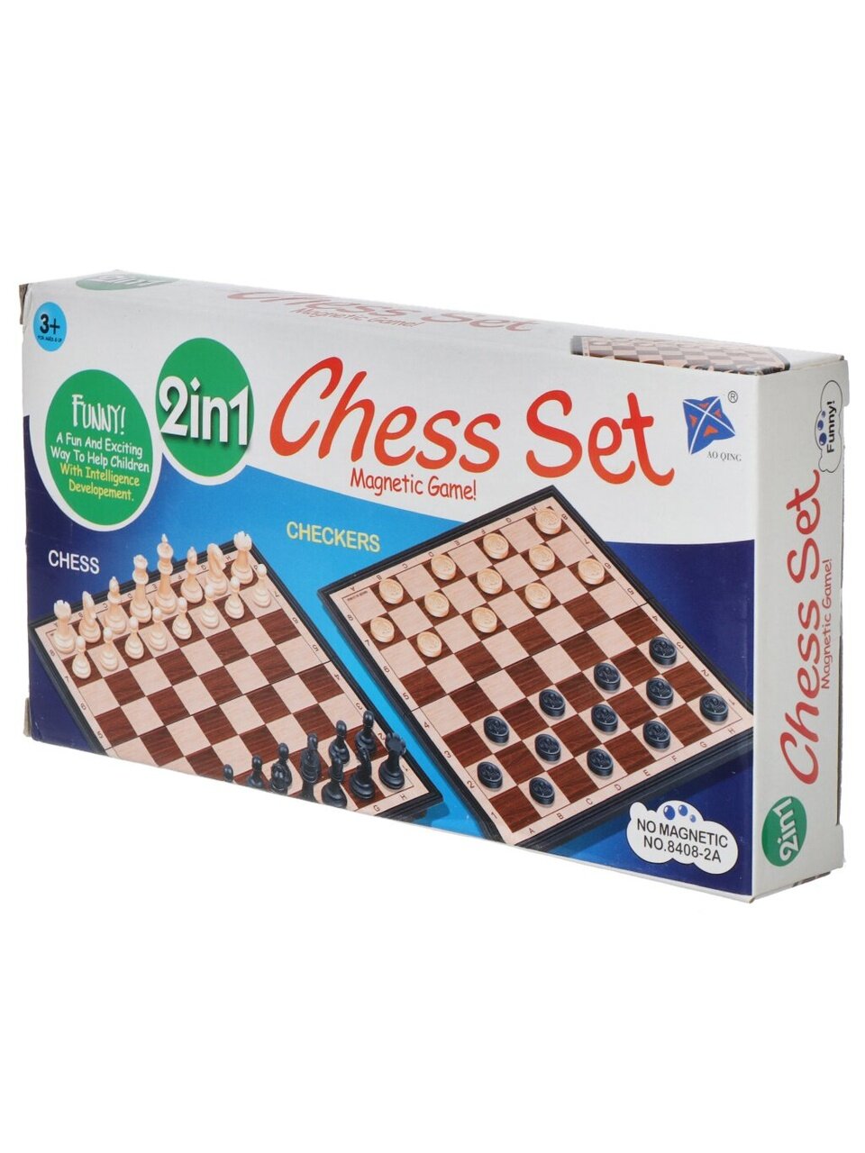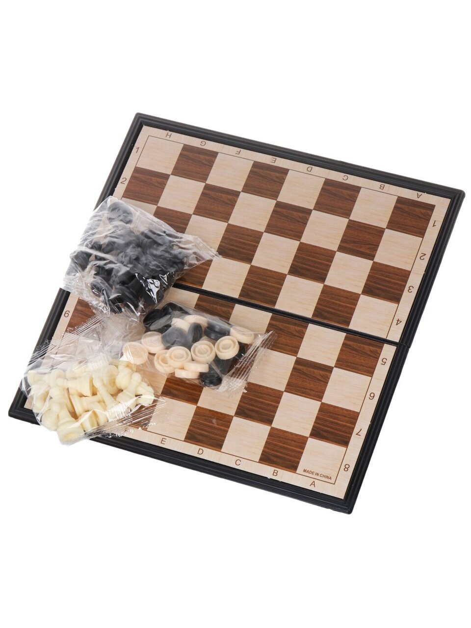 В комплекте настольной игры 2 в 1: игровая доска, набор шахматных фигур, набор шашек.
