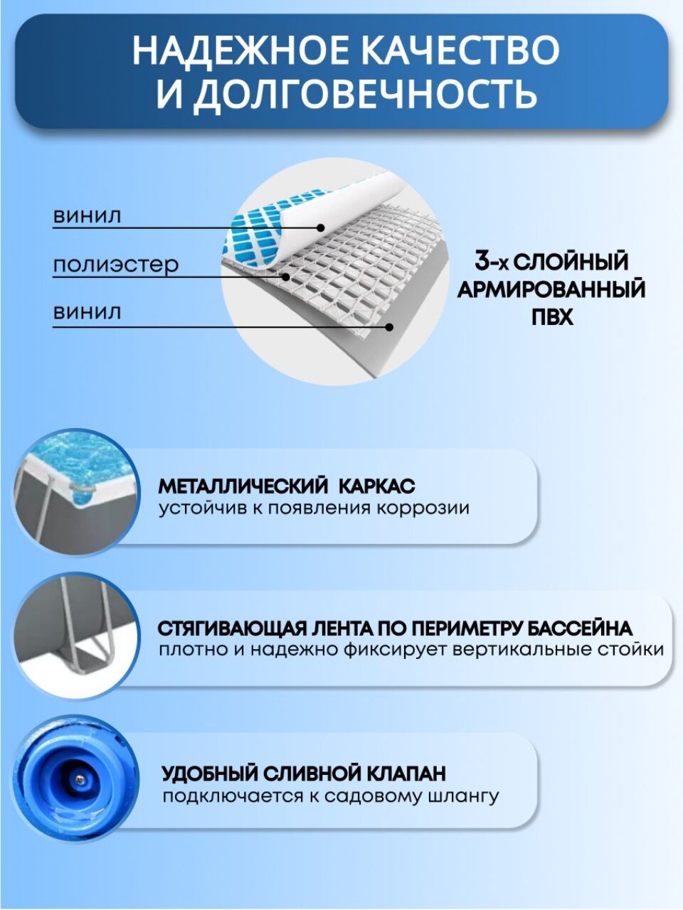 - Простота установки: сборка бассейна занимает всего 180 минут.