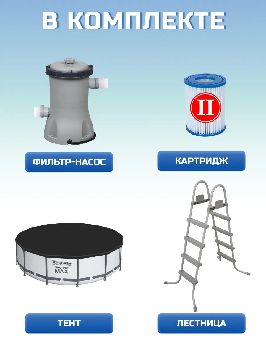 Комплектация: бассейн, картриджный фильтр-насос, картридж, лестница, тент.
