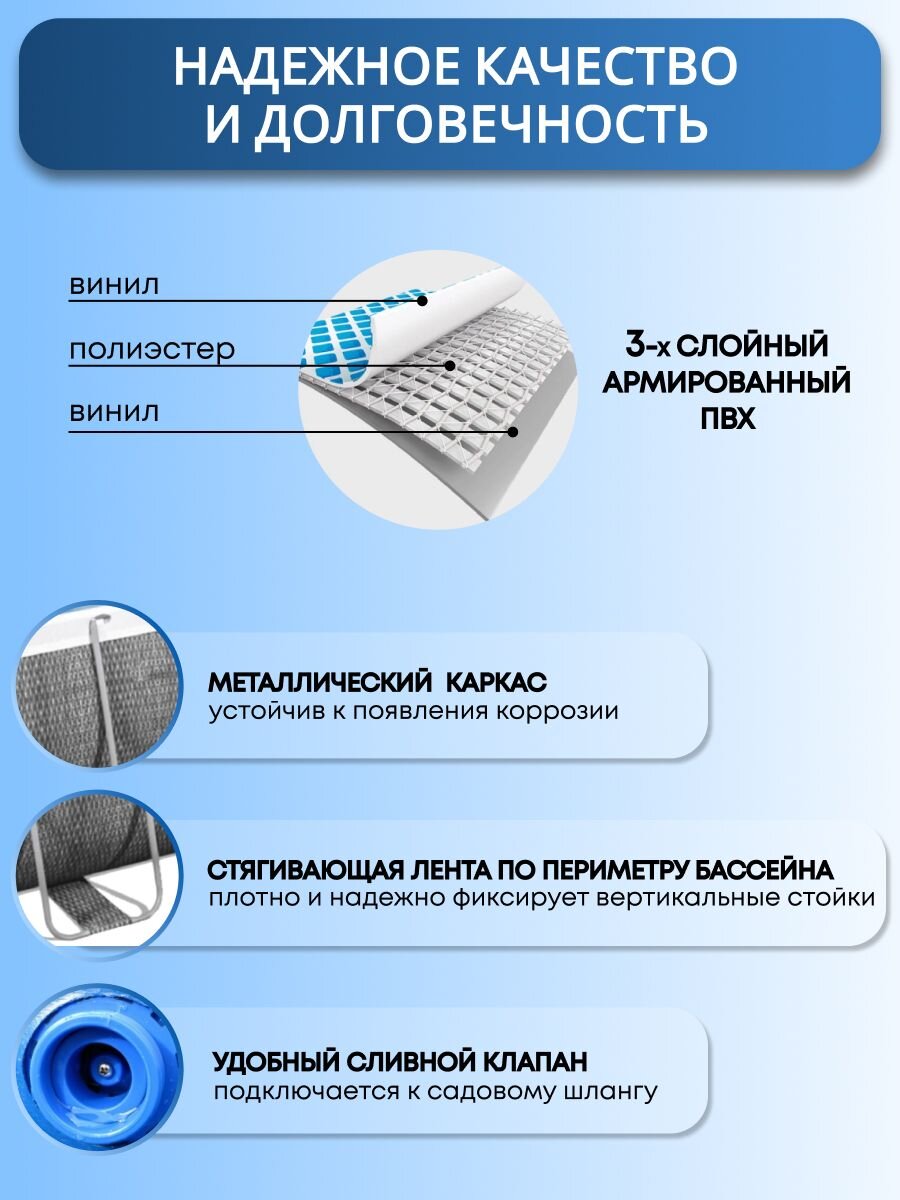 - Простота установки: бассейн легко собрать благодаря продуманной конструкции.