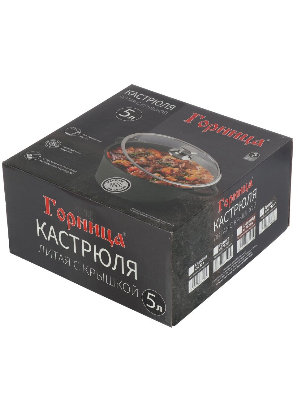 Кастрюля Горница Гранит Induction 5 л — надежный выбор для индукционных и газовых плит: антипригарное покрытие, стеклянная крышка, срок службы до 36 месяцев.
