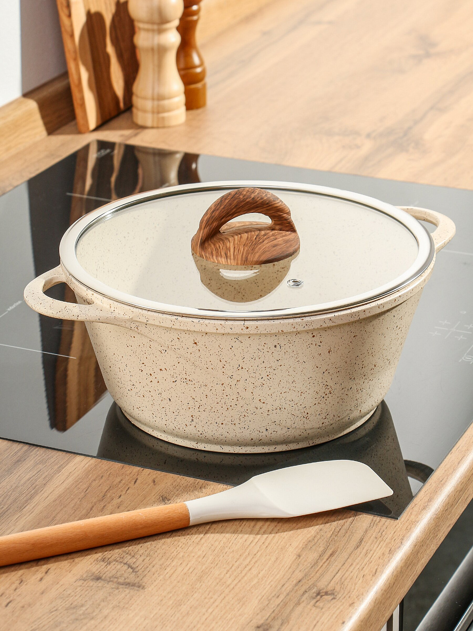 Кастрюля алюминиевая с мраморным антипригарным покрытием 3 л Гурман Estima — идеальный выбор для индукционных плит и быстрой готовки без пригорания. Прозрачная крышка, долговечность, стильный бежевый цвет.