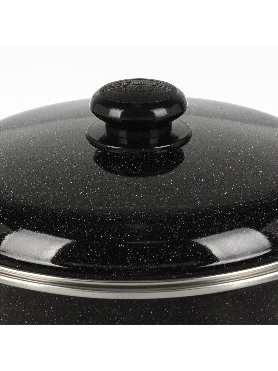 Кастрюля легко очищается как вручную, так и в посудомоечной машине. Отсутствие антипригарного покрытия исключает риск повреждения слоя при интенсивном использовании, а стальная крышка обеспечивает дополнительную прочность. Если вы ищете, какую кастрюлю выбрать для дачи или небольшой семьи — этот вариант сочетает компактность, надёжность и универсальность. Цвет «чёрный рябчик» смотрится стильно и не маркий, а отсутствие выпускного клапана на крышке делает кастрюлю безопасной при варке жидких блюд.
