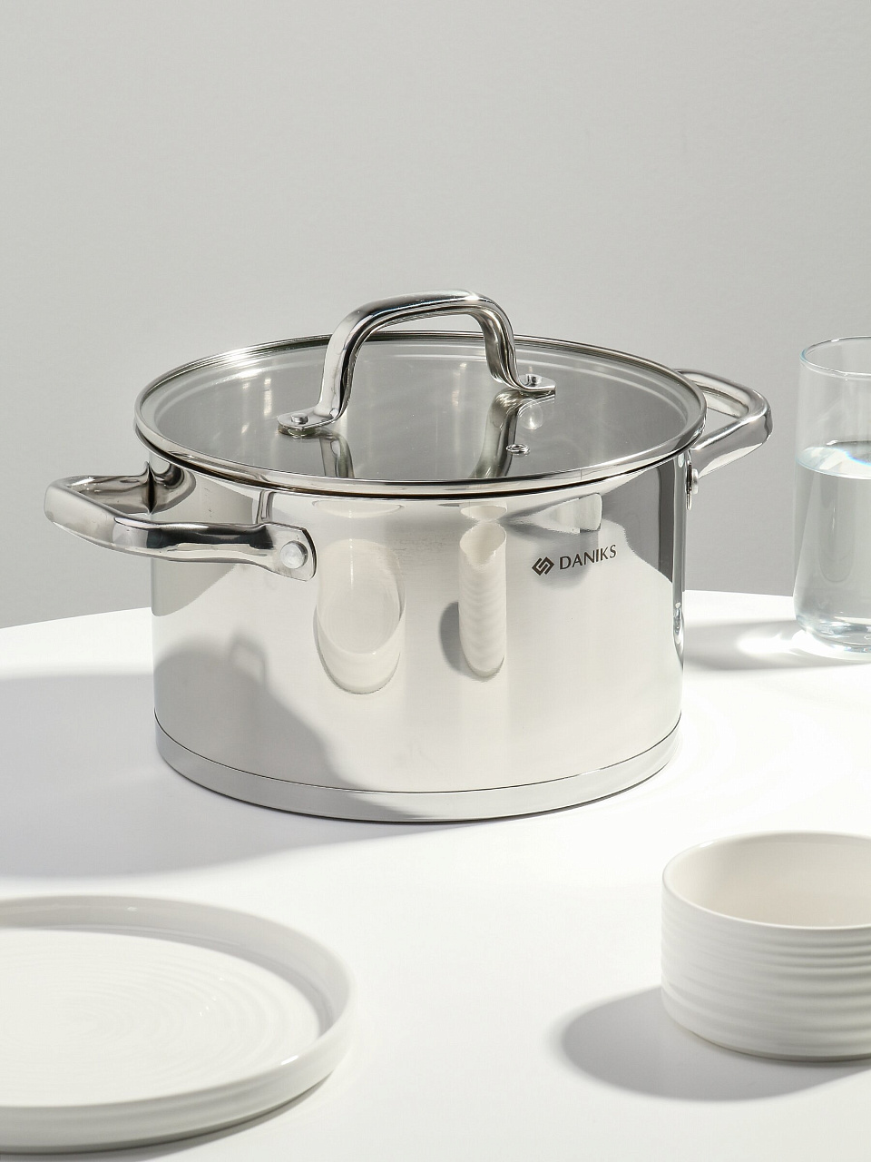 Кастрюля Daniks Рейн 2.9 л: нержавеющая сталь 201, стеклянная крышка, подходит для индукции — идеальный выбор для дома и дачи по выгодной цене.