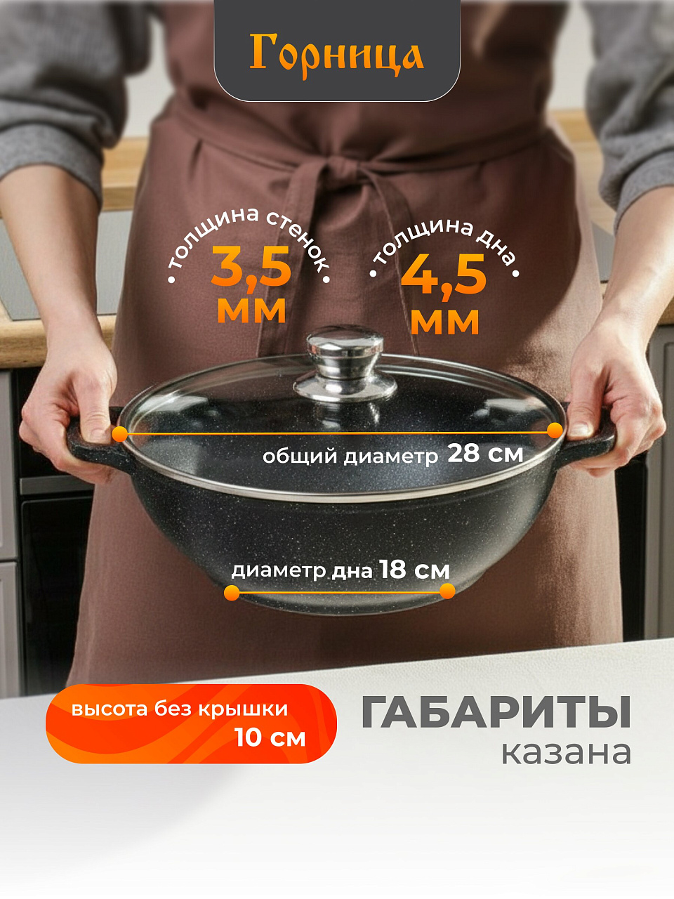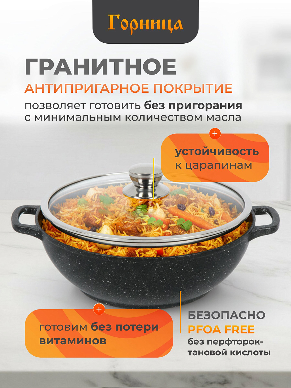 Литой алюминиевый казан с антипригарным покрытием подходит для газовых, электрических, стеклокерамических и индукционных плит. Трёхслойное антипригарное покрытие гарантирует долгий срок службы и качественное приготовление блюд.