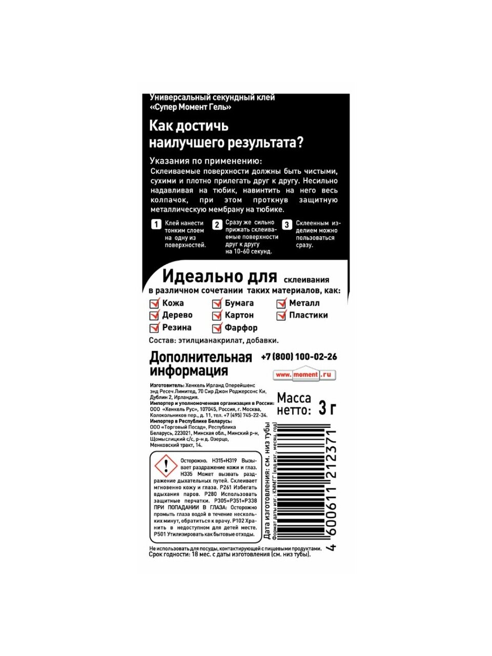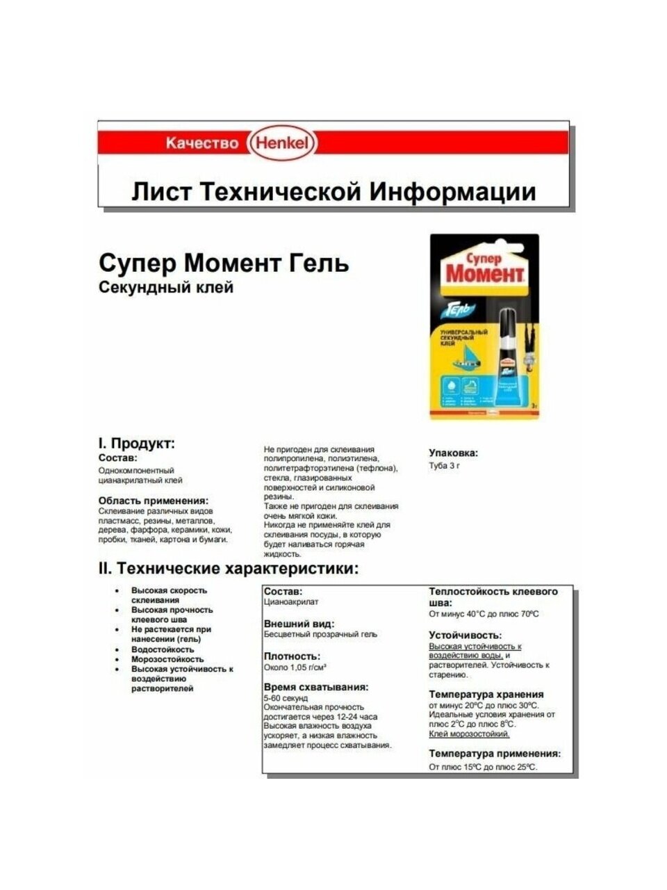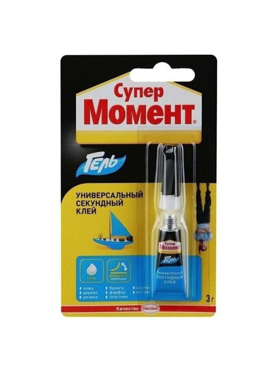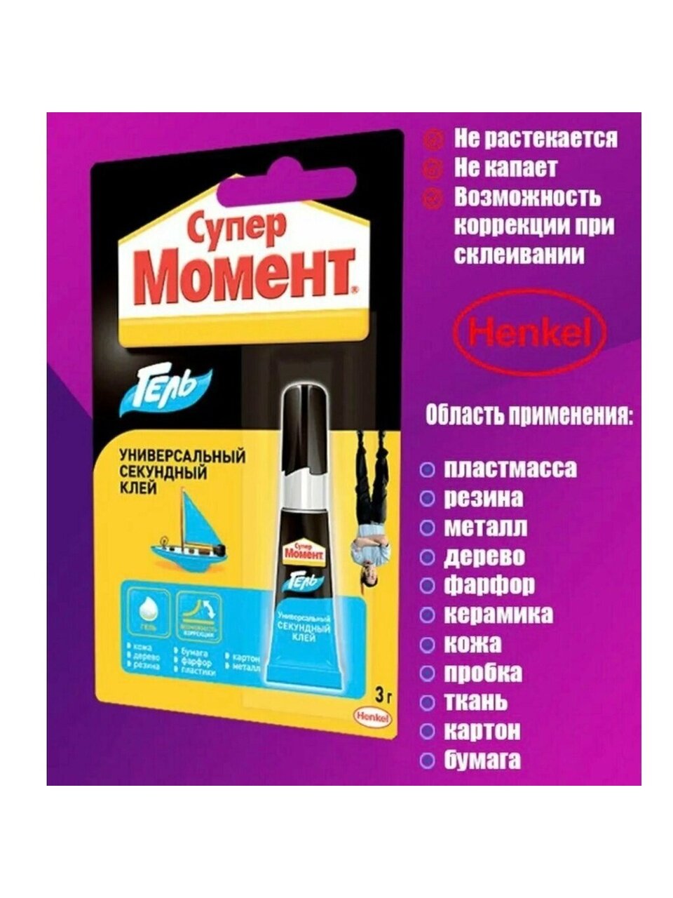 Супер Момент Гель предназначен для всех видов быстрых ремонтных работ в быту, в мастерской, в автомобиле, при конструировании моделей. Мгновенно склеивает в любых сочетаниях фарфор, керамику, дерево, кожу, резину, металл, пробку, картон, большинство пластиков. Клей не растекается, не капает. Идеален для склеивания на вертикальных и пористых поверхностях. Не пригоден для склеивания полиэтилена, тефлона, стиропора, полипропилена и синтетических тканей.