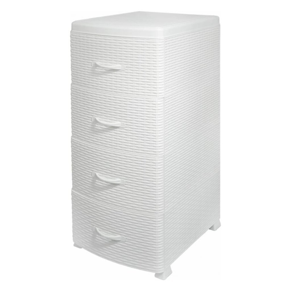 Комод из пищевого пластика с четырьмя выдвижными ящиками предназначен для хранения вещей и продуктов питания и гармонично впишется в интерьер любой комнаты. Легкий и вместительный комод поможет обеспечить порядок, избавит от разбросанных игрушек и одежды, убережет продукты от пыли и заветривания. Текстура с имитацией натурального плетения «Ротанг» привнесет уют в ваш интерьер и придаст индивидуальность. Не рекомендуется размещение пластикового комода вблизи батарей центрального отопления и электрических обогревателей.