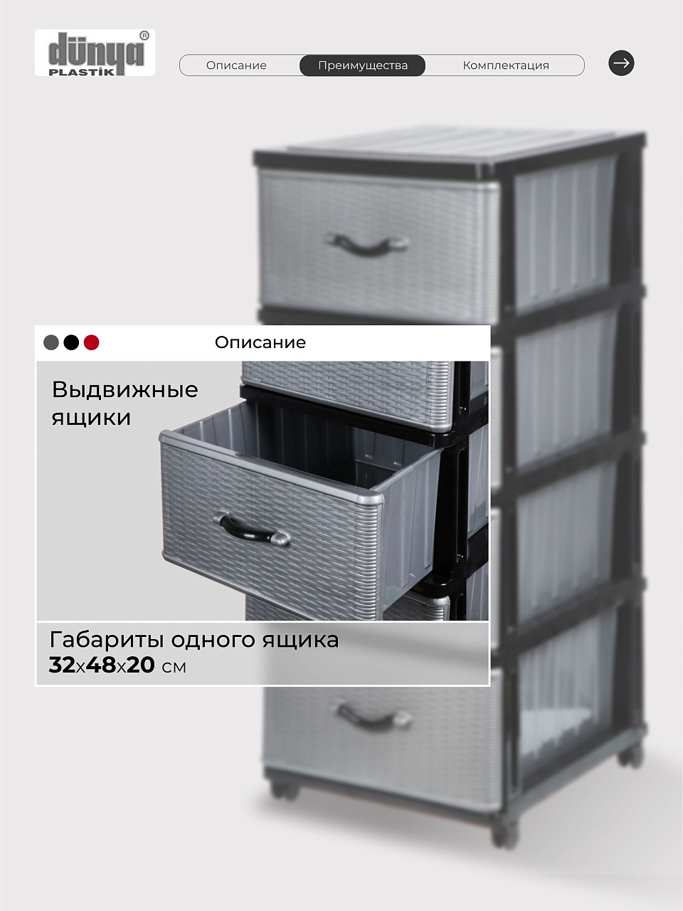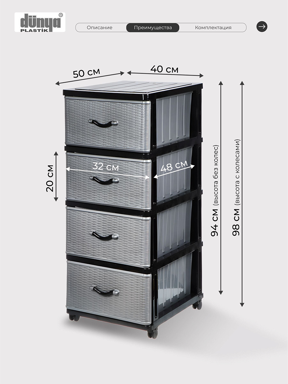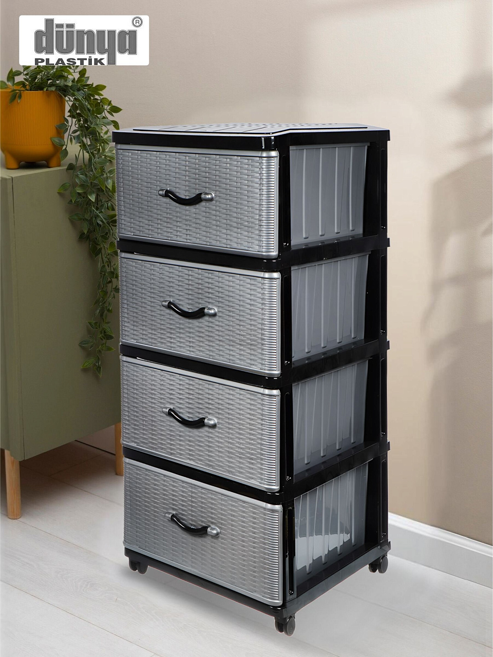 Вы можете приобрести «Комод 4 ящика, Дюна, 40х50х94 см, черно-серебряный, 04014, Dunya Plastik» и другие товары в нашем интернет-магазине в Иваново по низким ценам и с бесплатным самовывозом.