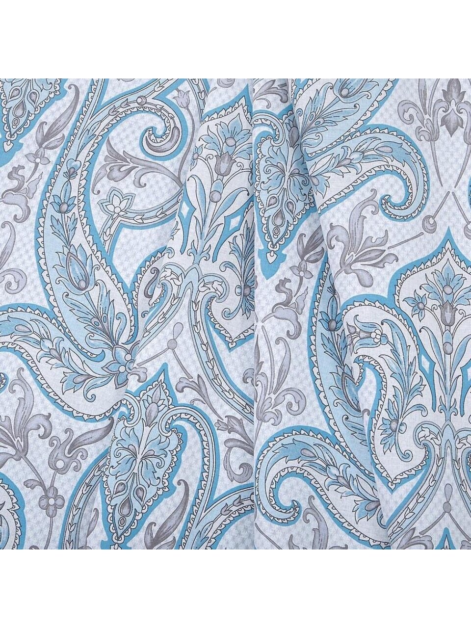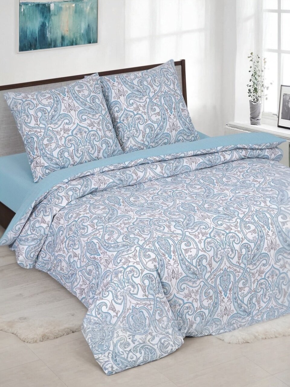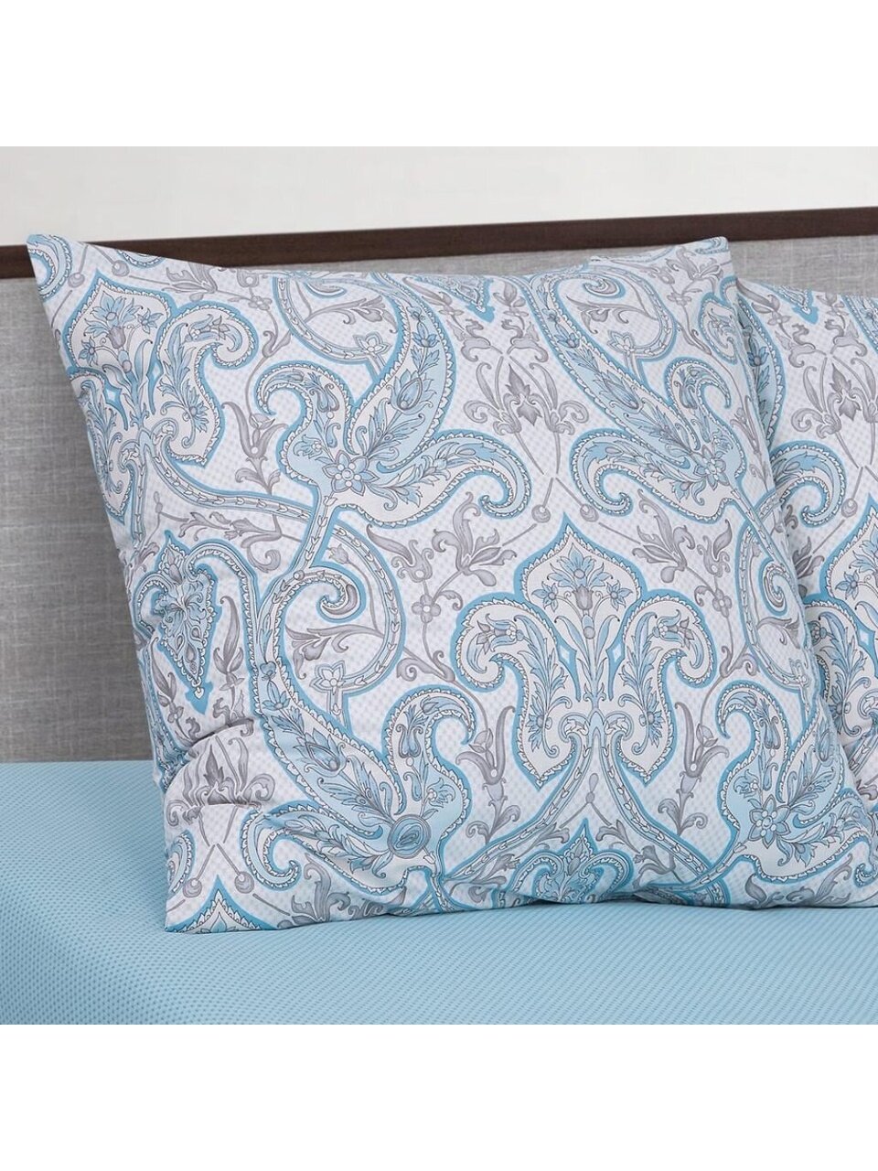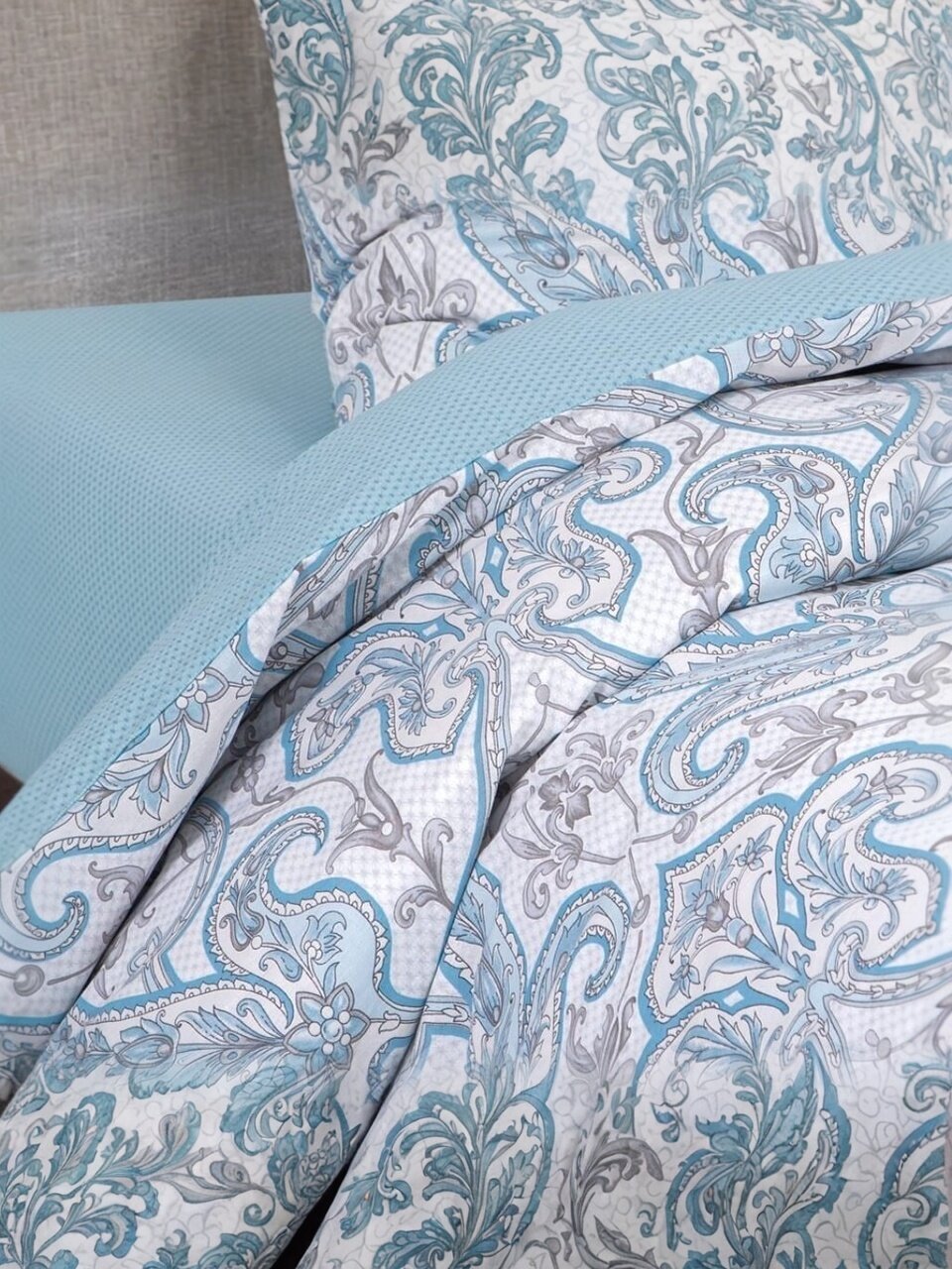 Отличие комплекта — простыня на резинке: она надежно держится на матрасе, не образует складок. В отличие от стандартных комплектов, в данном наборе два пододеяльника, что удобно для семейных пар с разными одеялами. Голубой цвет и изысканный орнамент добавят уюта и свежести спальне. Комплект в подарочной упаковке — практичный выбор для подарка родным или друзьям.