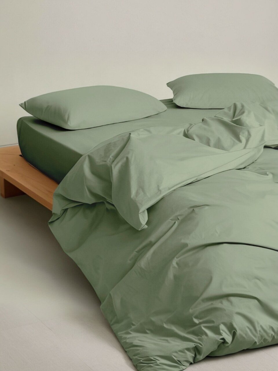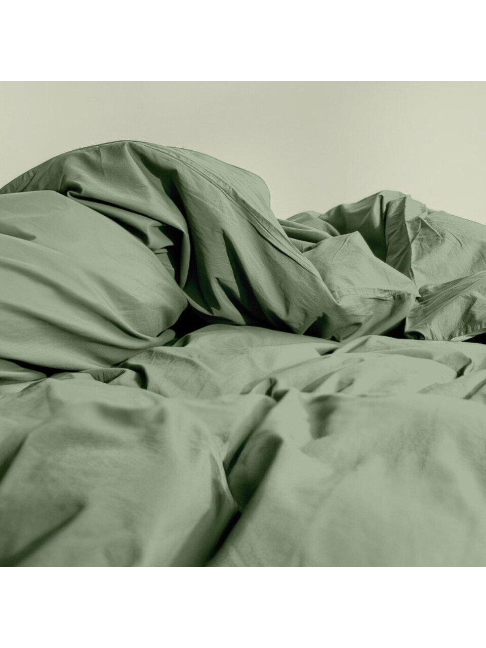 В комплекте четыре предмета: простыня, пододеяльник, две наволочки. Состав — 100% хлопок, ткань поплин, цвет зелёный.