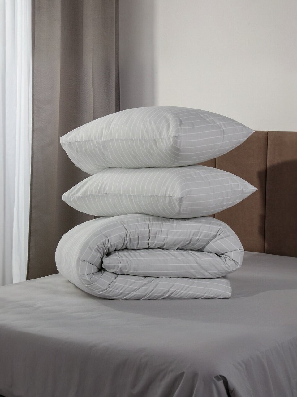 Двуспальный комплект постельного белья Silvano 20465 выполнен из натурального хлопка-поплина — материала, который ценят за мягкость, прочность и долговечность. Серый цвет с полосками отлично впишется в современный интерьер, а отсутствие простыни позволяет подобрать её индивидуально по вашим предпочтениям. Если вы ищете, какое постельное бельё выбрать для дачи или дома, обратите внимание на этот комплект: он не скатывается, не линяет и сохраняет форму после многократных стирок.