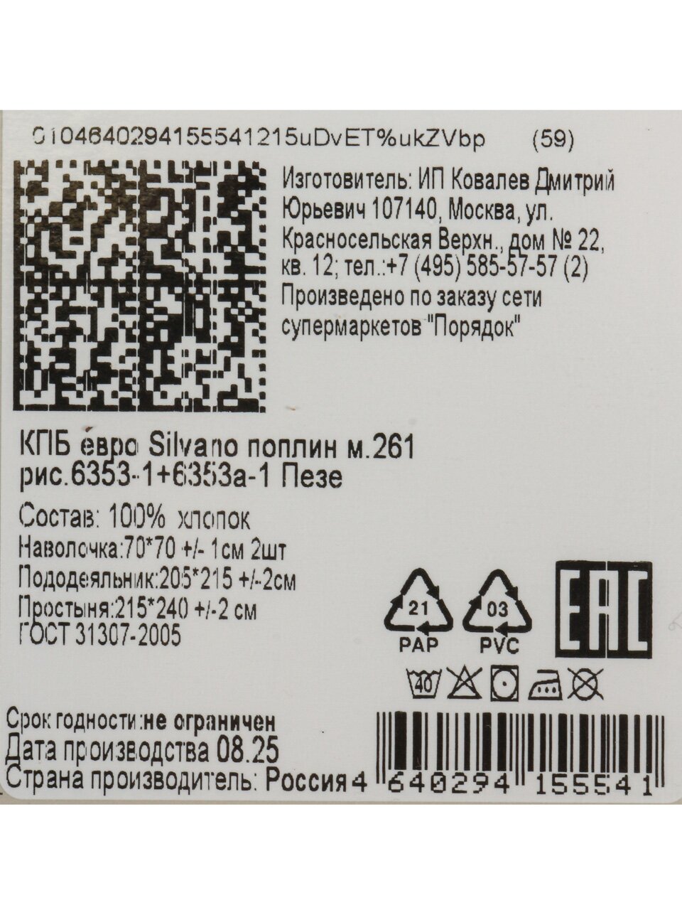 Вы можете приобрести «Постельное белье евро, простыня 215х240 см, 2 наволочки 70х70 см, пододеяльник 205х215 см, Silvano, поплин, Пезе» и другие товары в нашем интернет-магазине в Ярославле по низким ценам и с бесплатным самовывозом.