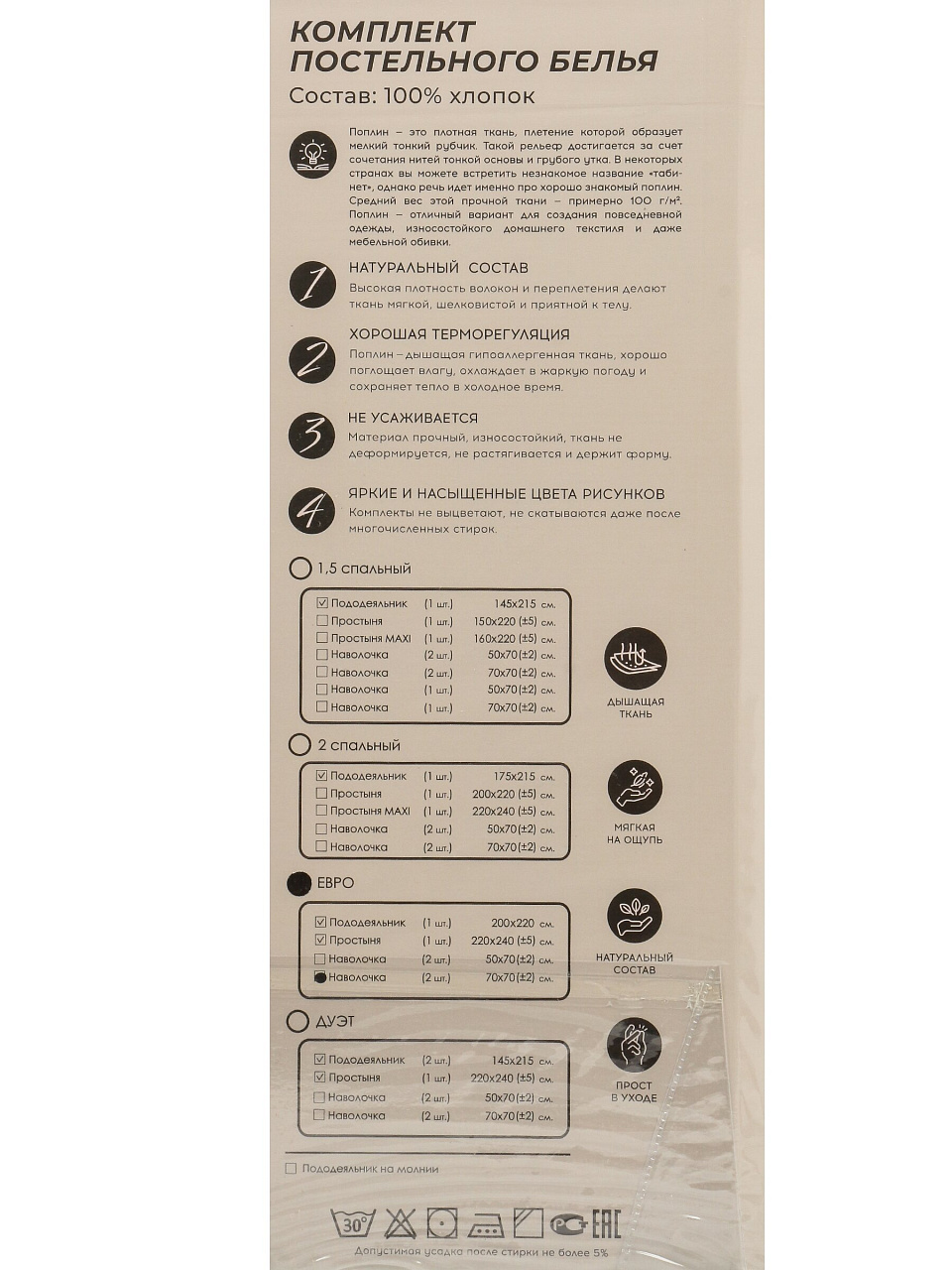 - 100% хлопковый поплин: дышащий, гипоаллергенный, прочный — не скатывается и не линяет после стирки.