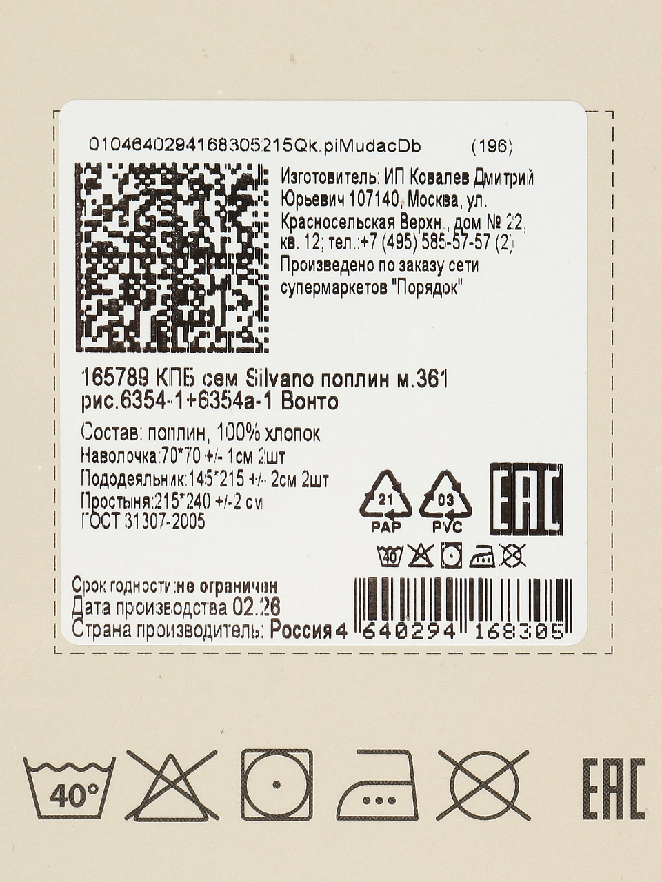 Вы можете приобрести «Постельное белье семейное, простыня 215х240 см, 2 наволочки 70х70 см, 2 пододеяльника 145х215 см, Silvano, поплин, Вонто» и другие товары в нашем интернет-магазине в Тамбове по низким ценам и с бесплатным самовывозом.