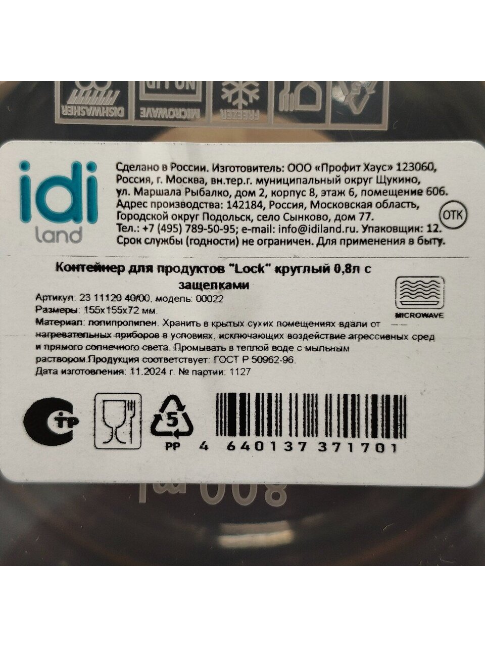 Контейнер пищевой IDIland Lock 0.8 л: компактное хранение и свежесть продуктов дома и на даче. Прочный пластик, герметичная крышка, универсальный дизайн.