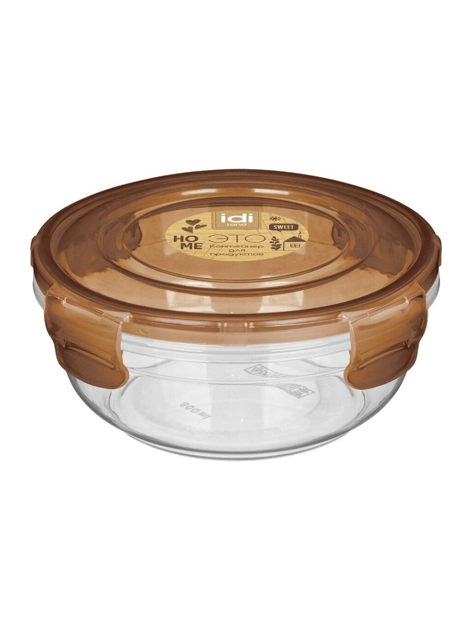 Контейнер круглый, объём 0.8 литра, материал — прочный пластик, цвет — коричневый. Отлично помещается в стандартных холодильниках и сумках для обедов.