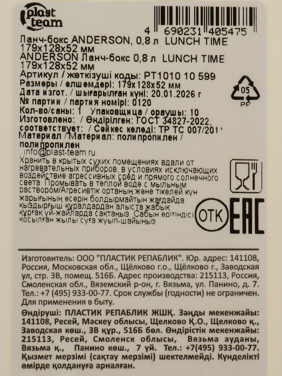 Контейнер пластик, 0.8 л, 17.9х12.8х5.2 см, прямоугольный, Plast team, Anderson, Lunch Time, PT101010599 - фото 1 от пользователя