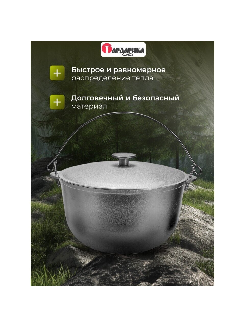 - Удобная ручка облегчает переноску казана и позволяет подвесить его над костром для приготовления пищи на открытом воздухе.